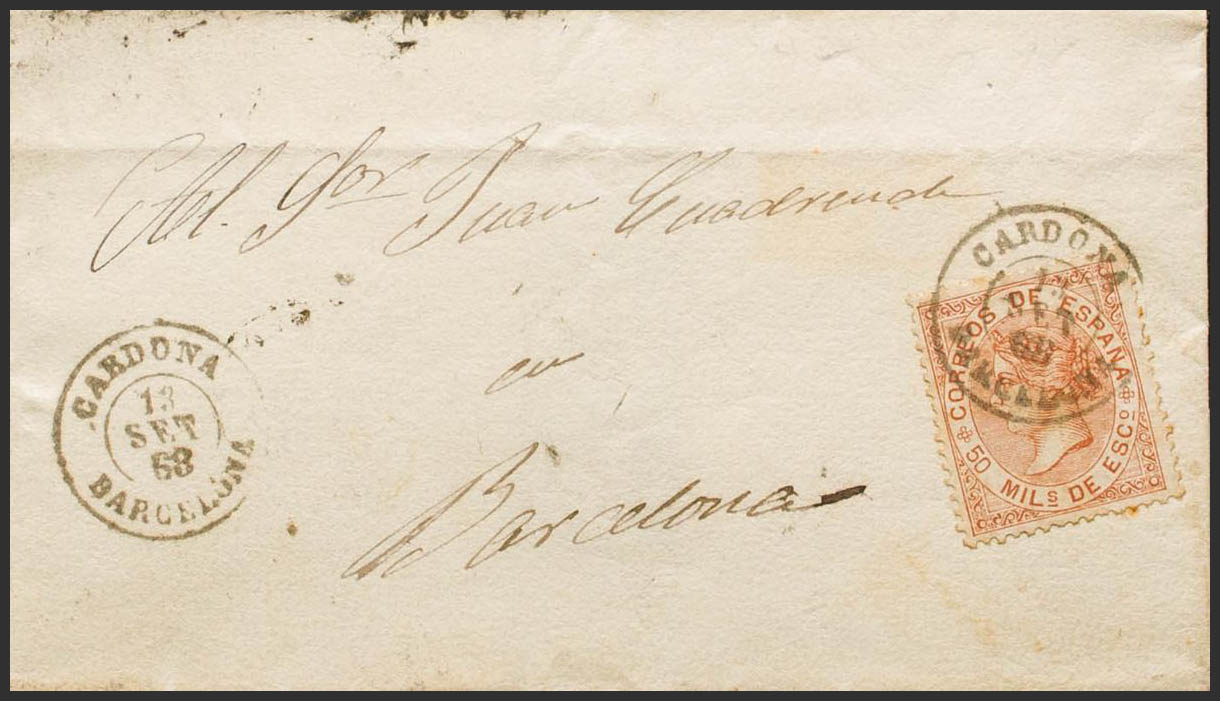 96. 1868. 50 mils castaño amarillo. CARDONA a BARCELONA. Matasello CARDONA / BARCELONA. MAGNIFICA Y RARA. Ex-Tizón.