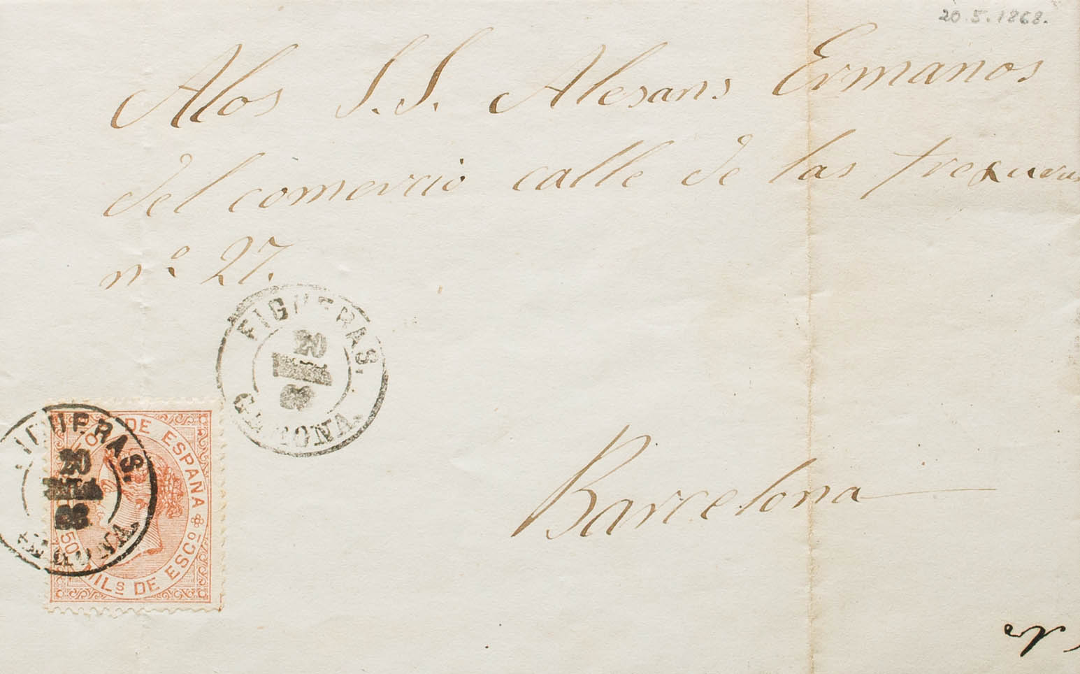 96. 1868. 50 mils castaño amarillo (doblez de archivo). FIGUERAS a BARCELONA. Matasello FIGUERAS / GERONA. MAGNIFICA. Ex-Tizón.