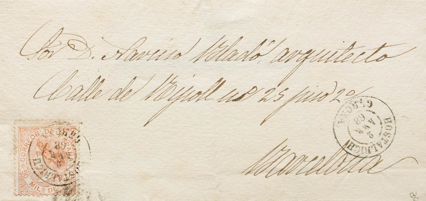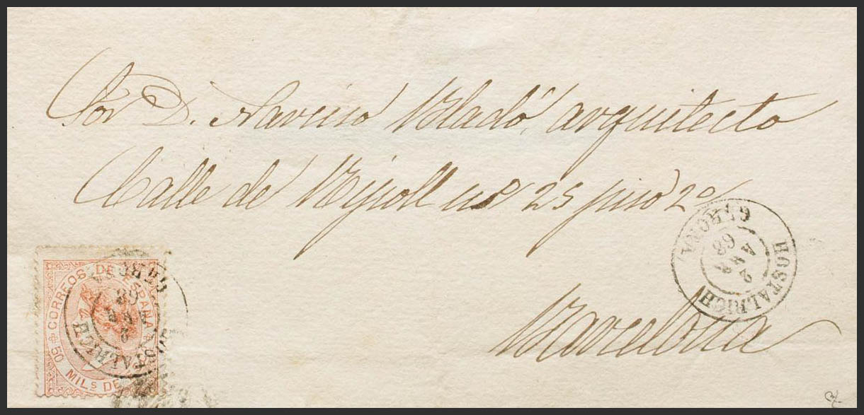 96. 1868. 50 mils castaño amarillo. HOSTALRICH a BARCELONA. Matasello HOSTALRICH / GERONA. MAGNIFICA. Ex-Tizón.