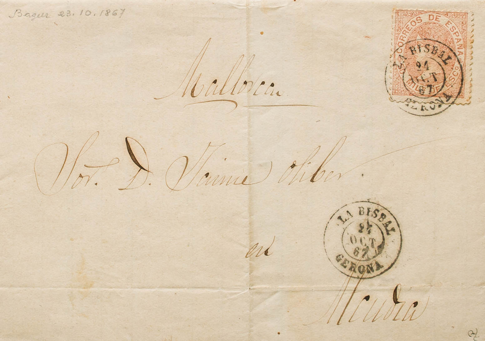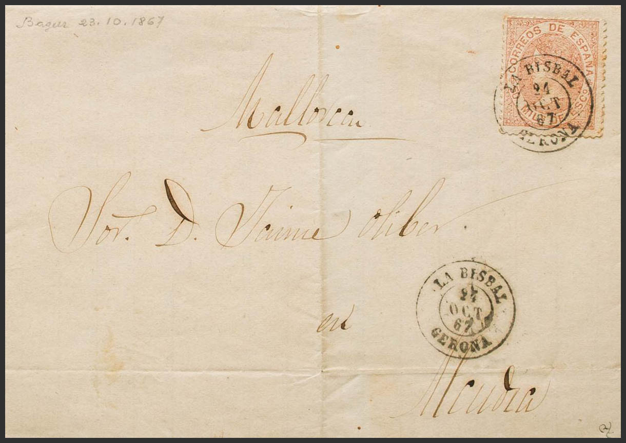 96. 1867. 50 mils castaño amarillo. BAGUR a MADRID. Matasello LA BISBAL / GERONA. MAGNIFICA Y RARA. Ex-Tizón.