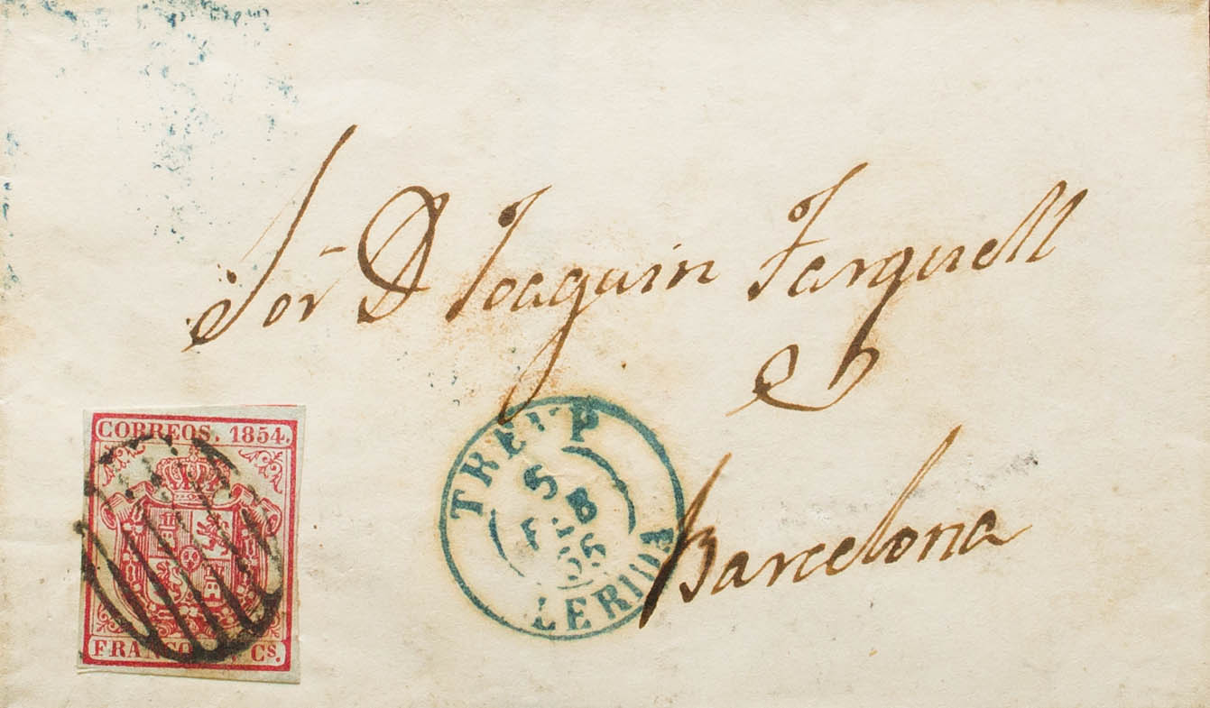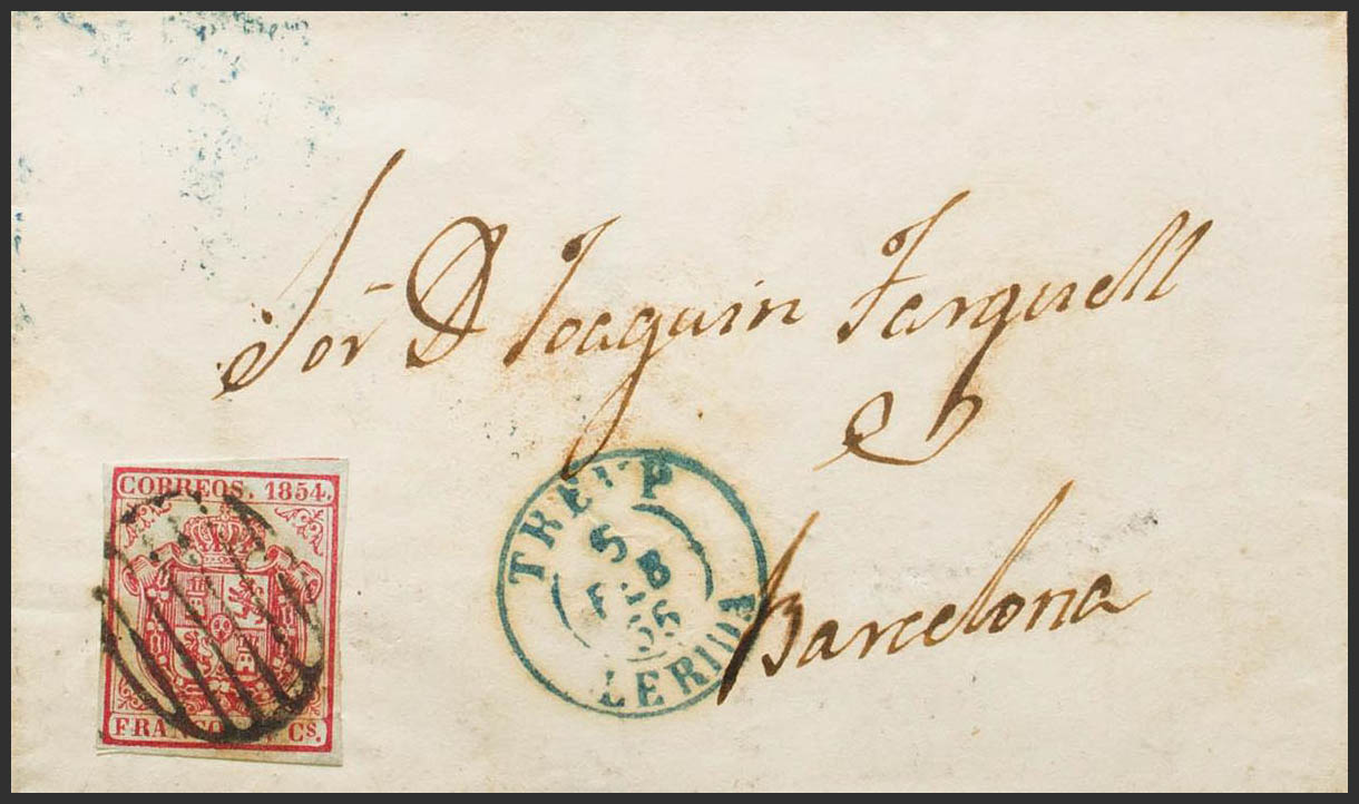 33A. 1855. 4 cuartos carmÃn. TREMP a BARCELONA. En el frente fechador TREMP / LERIDA (Tipo I), en azul. MAGNIFICA. Ex-Tizón.