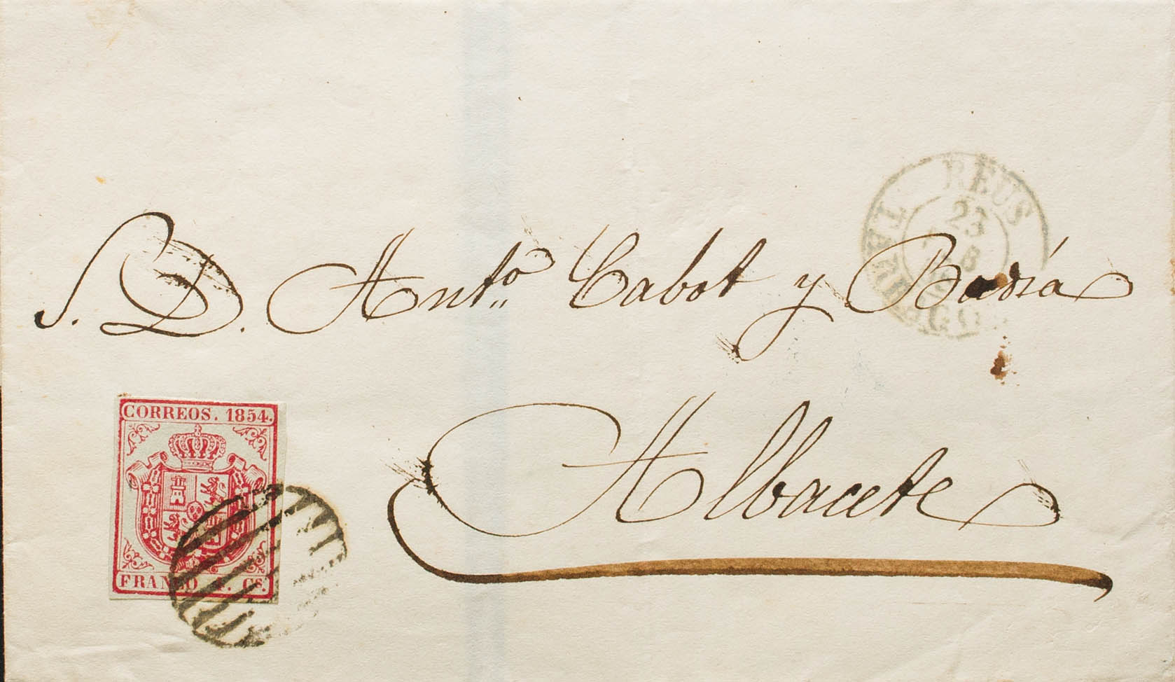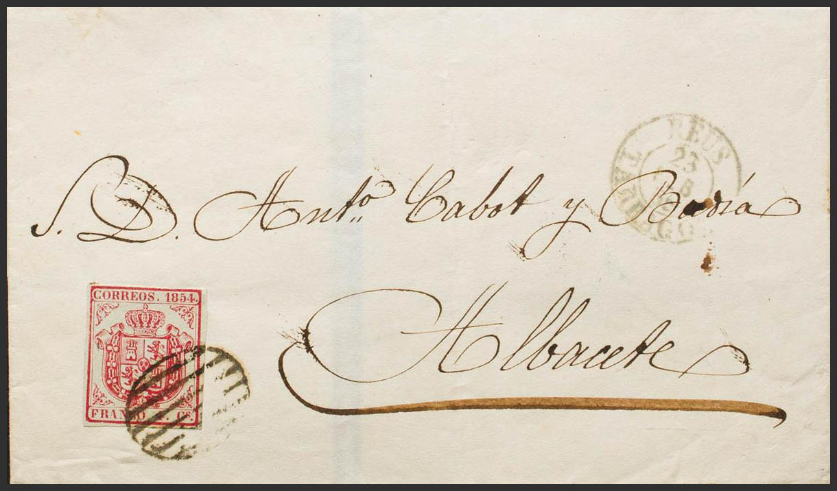 33A. 1855. 4 cuartos carmÃn. REUS a ALBACETE. En el frente fechador REUS / TARRAGONA (Tipo I), en azul. MAGNIFICA. Ex-Tizón.