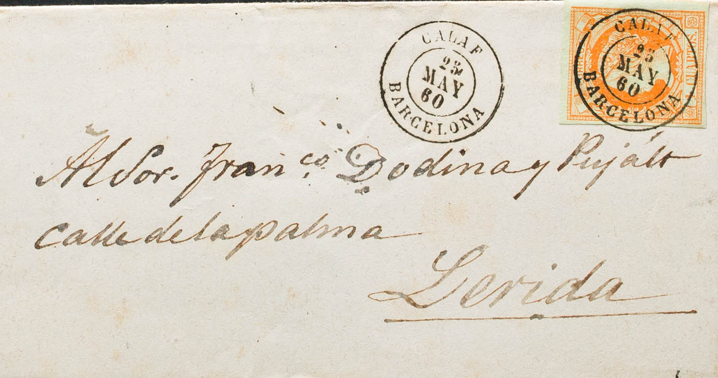52. 1860. 4 cuartos naranja. CALAF a LERIDA. Matasello CALAF / BARCELONA. MAGNIFICA Y MUY RARA. Ex-Tizón.