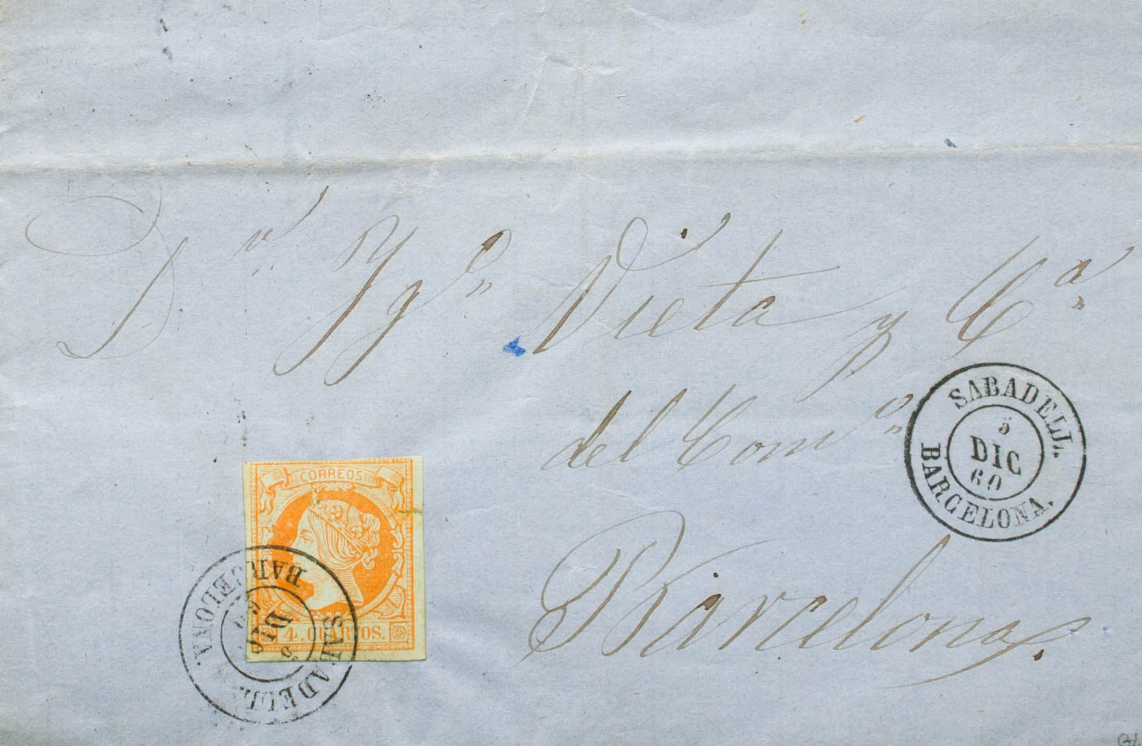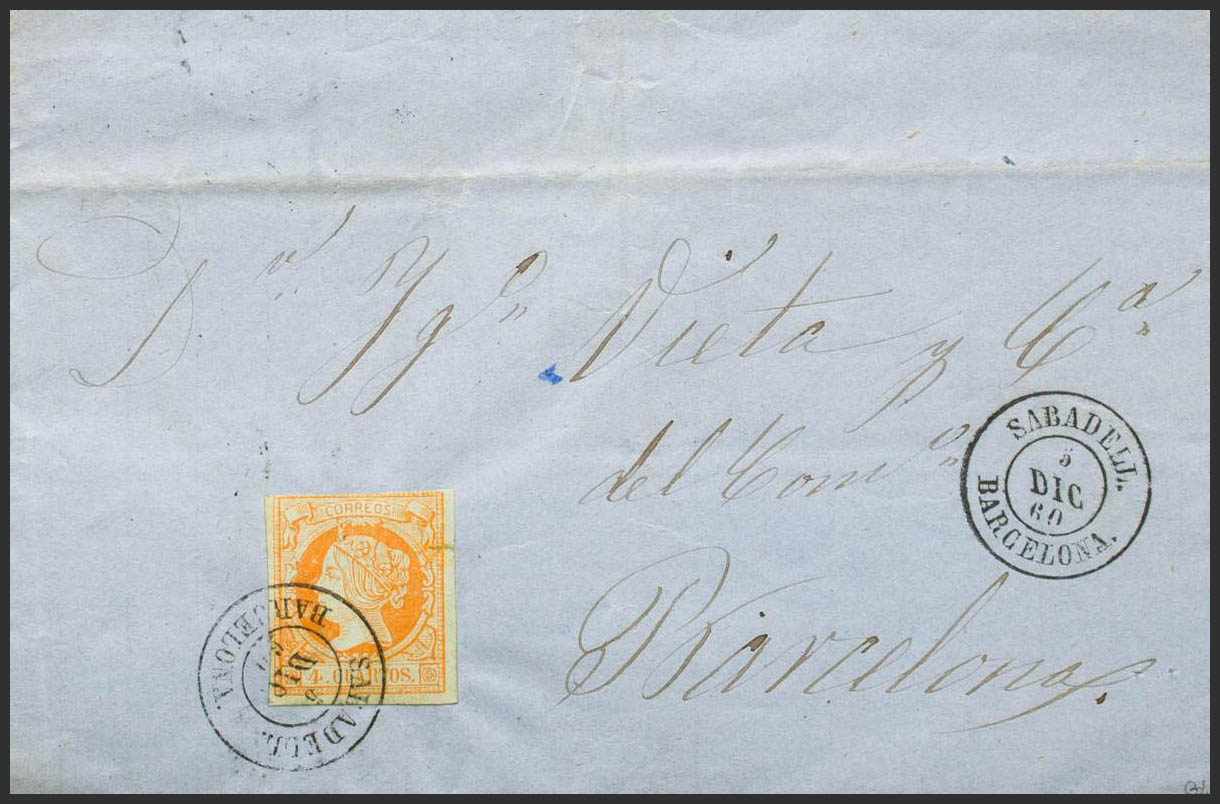 52. 1860. 4 cuartos naranja. SABADELL a BARCELONA. Matasello SABADELL / BARCELONA. MAGNIFICA. Ex-Tizón.