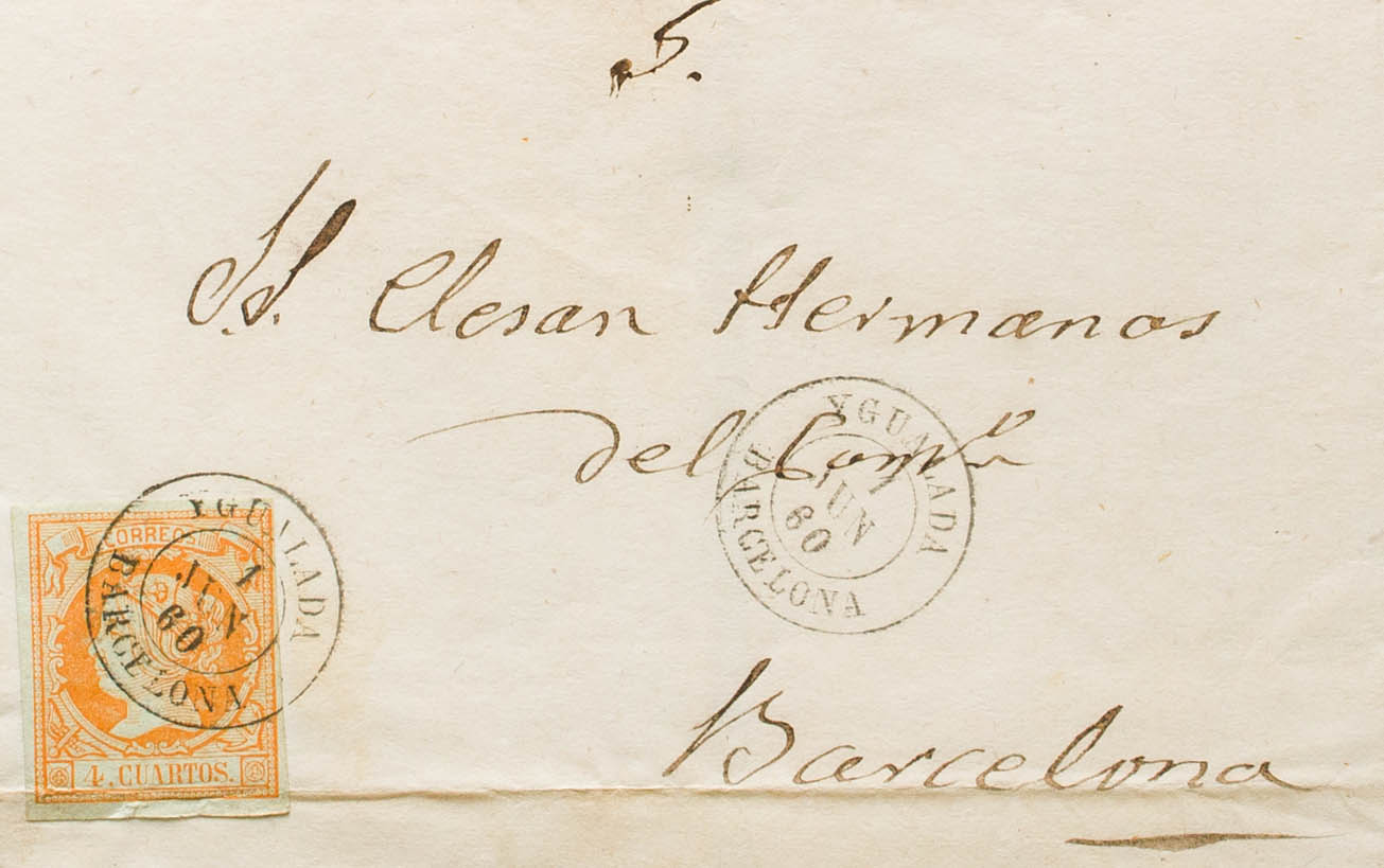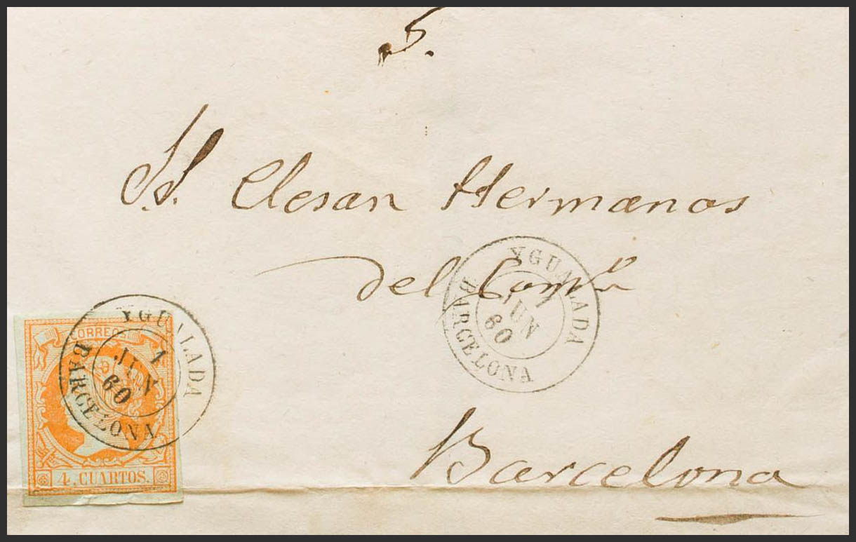 52. 1860. 4 cuartos naranja (doblez de archivo). IGUALADA a BARCELONA. Matasello YGUALADA / BARCELONA. MAGNIFICA. Ex-Tizón.