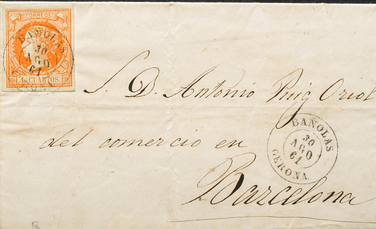 52. 1861. 4 cuartos naranja. BAÑOLAS a BARCELONA. Matasello BAÑOLAS / GERONA. MAGNIFICA Y MUY RARA. Ex-Tizón.