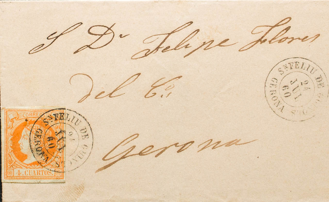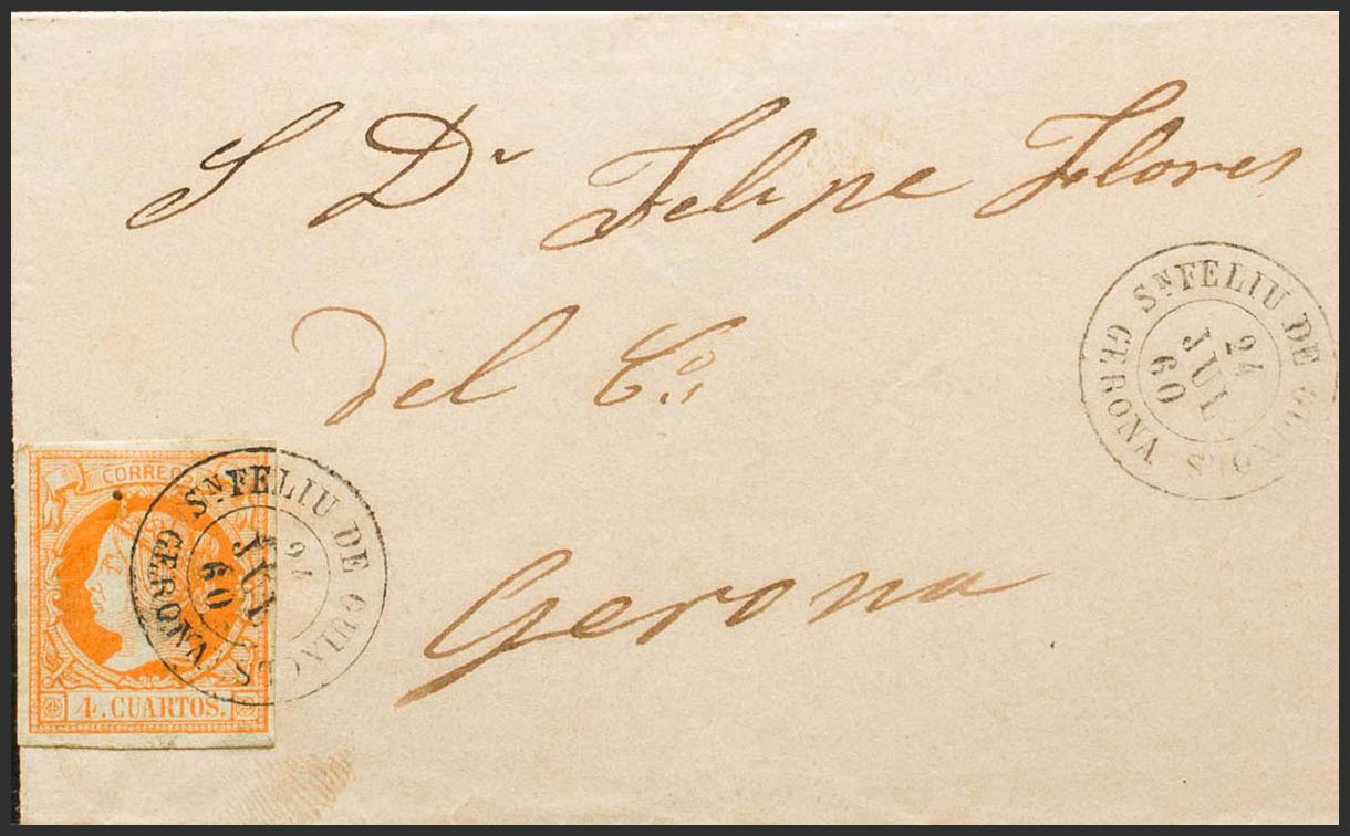 52. 1860. 4 cuartos naranja. SAN FELIU DE GUIXOLS a GERONA. Matasello SN. FELIU DE GUIXOLS / GERONA. MAGNIFICA. Ex-Tizón.