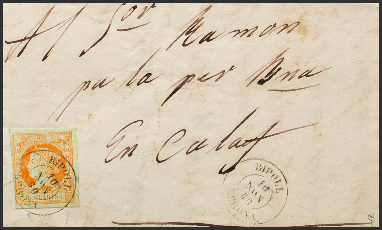 52. 1860. 4 cuartos naranja. CAMP DE BANOL a CALAF. Matasello RIPOLL / GERONA. MAGNIFICA. Ex-Tizón.