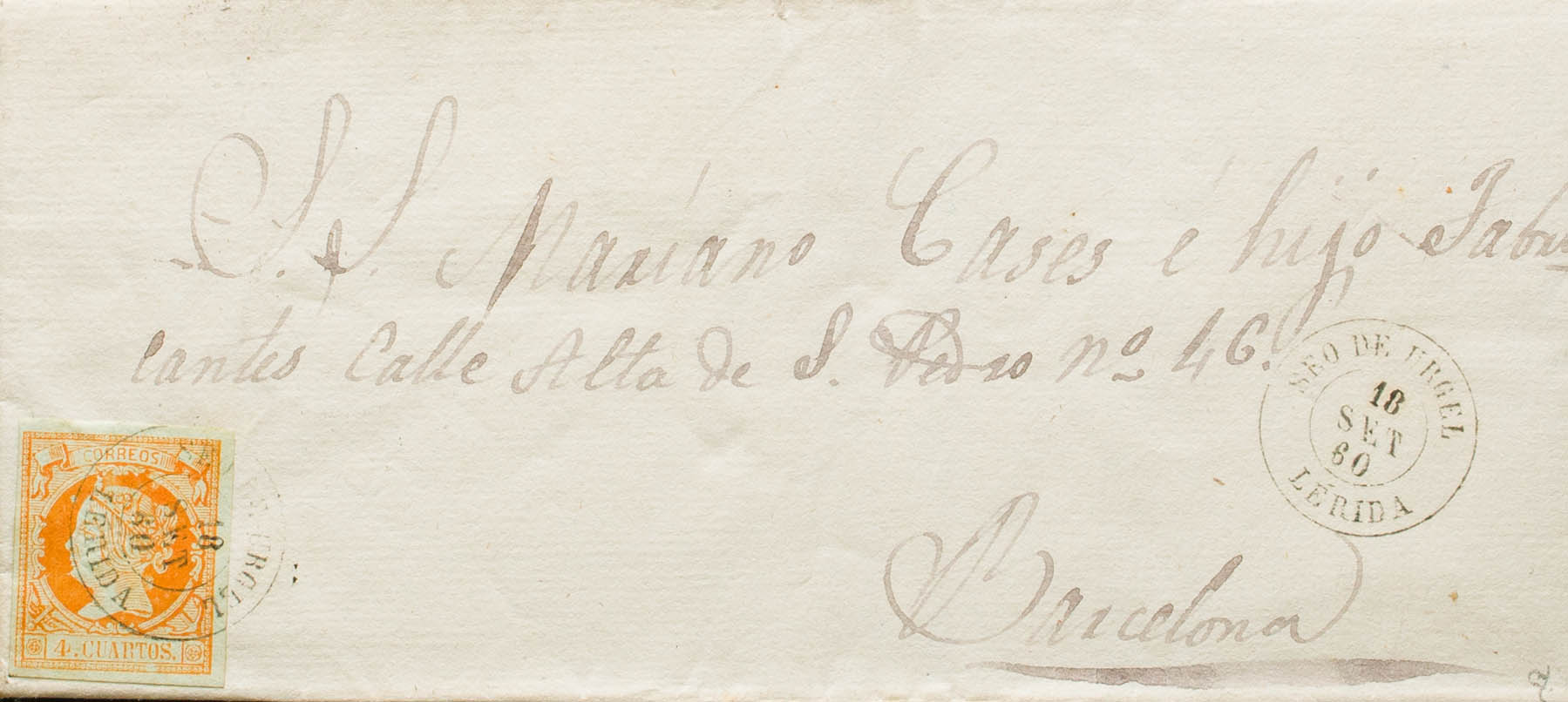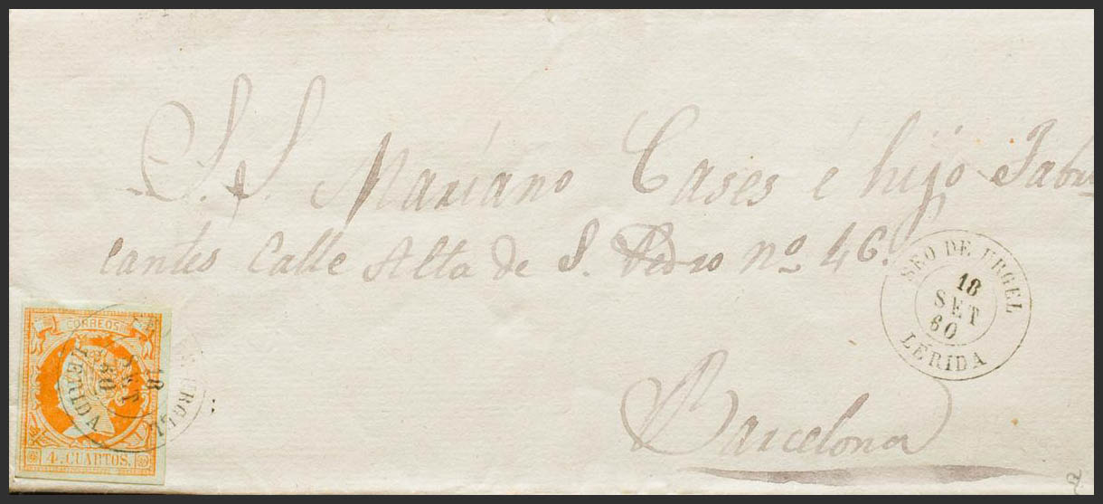 52. 1860. 4 cuartos naranja. SEO DE URGEL a BARCELONA. Matasello SEO DE URGEL / LERIDA. MAGNIFICA Y RARA. Ex-Tizón.