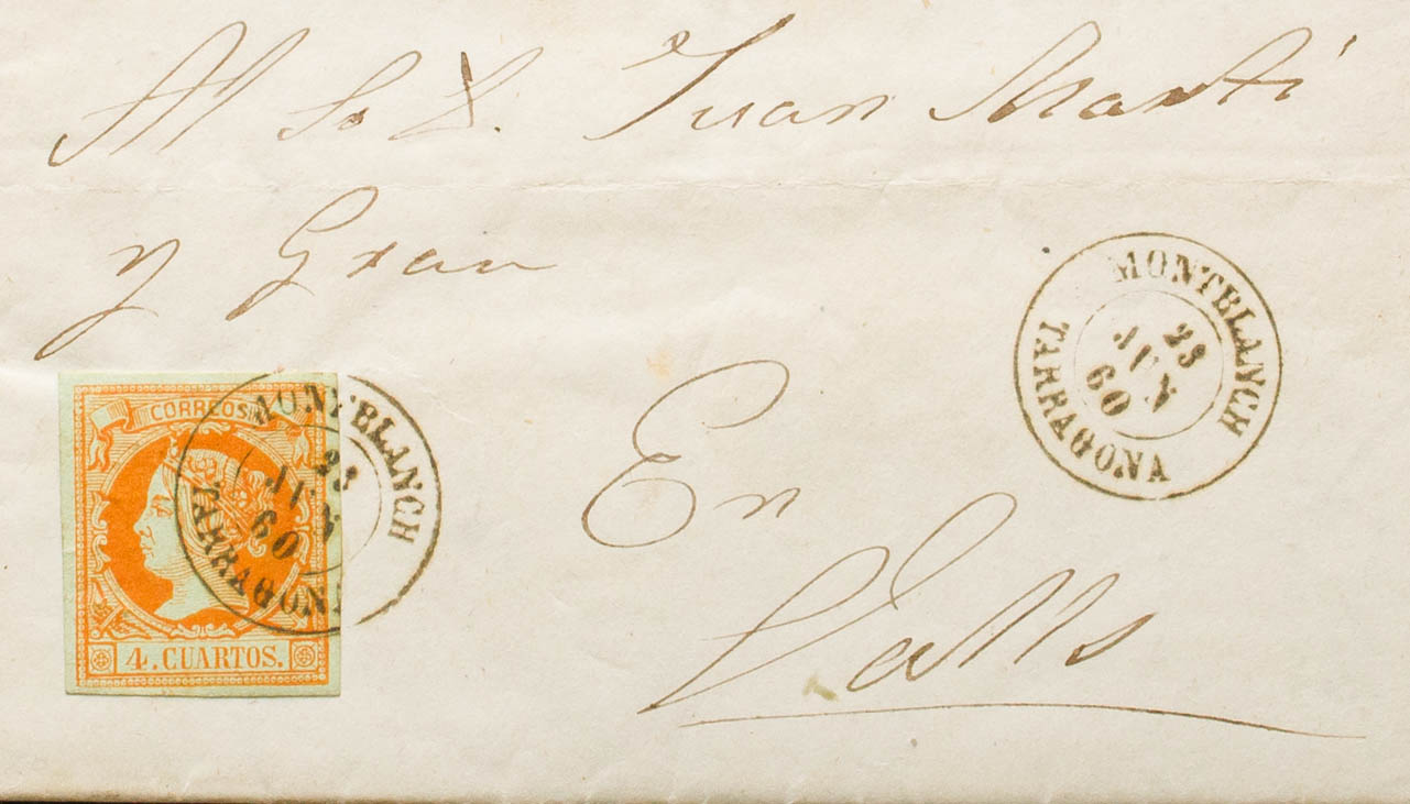 52. 1860. 4 cuartos naranja. MONTBLANCH a VALLS. Matasello MONTBLANCH / TARRAGONA. MAGNIFICA Y RARA. Ex-Tizón.