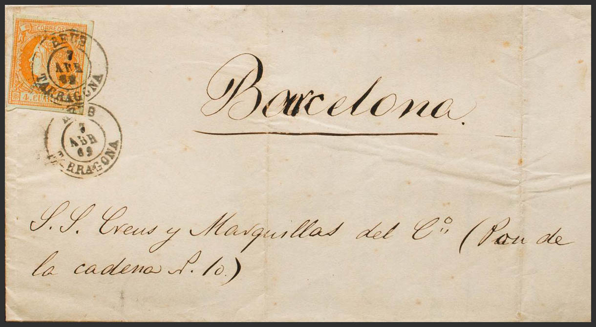 52. 1862. 4 cuartos naranja. REUS a BARCELONA. Matasello REUS / TARRAGONA. MAGNIFICA. Ex-Tizón.