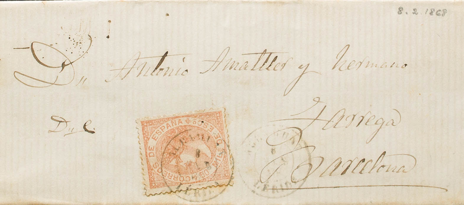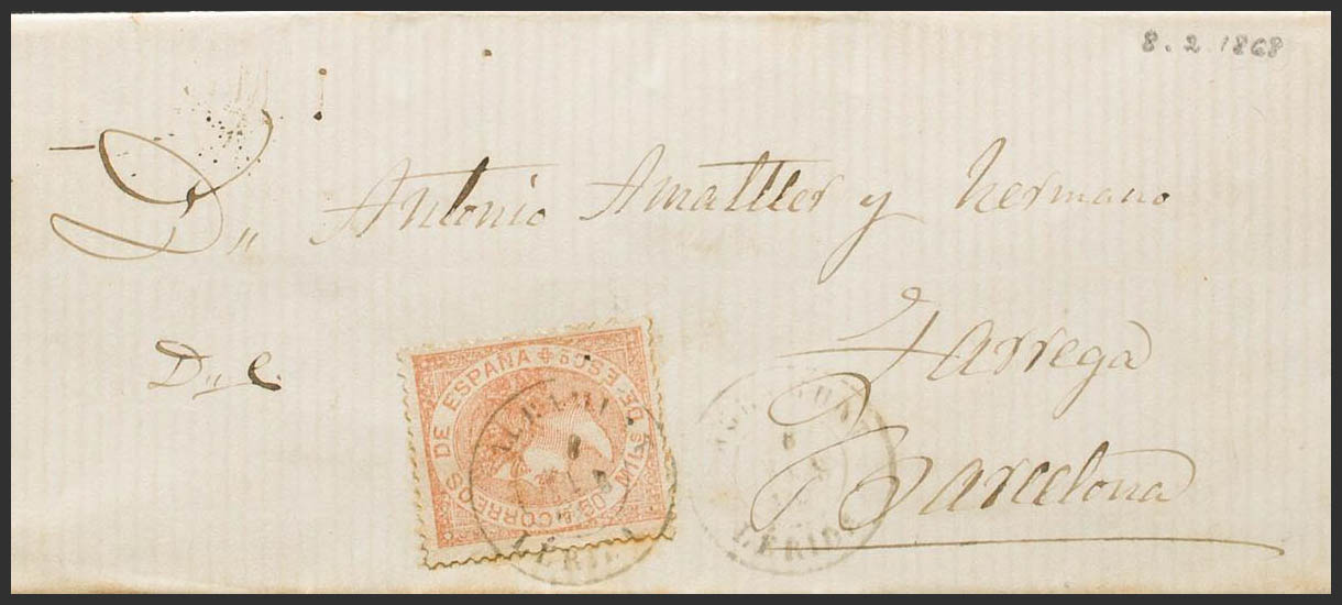 96. 1868. 50 mils castaño amarillo. AGRAMUNT a BARCELONA. Matasello AGRAMUNT / LERIDA. MAGNIFICA. Ex-Tizón.