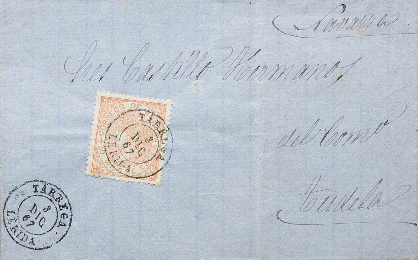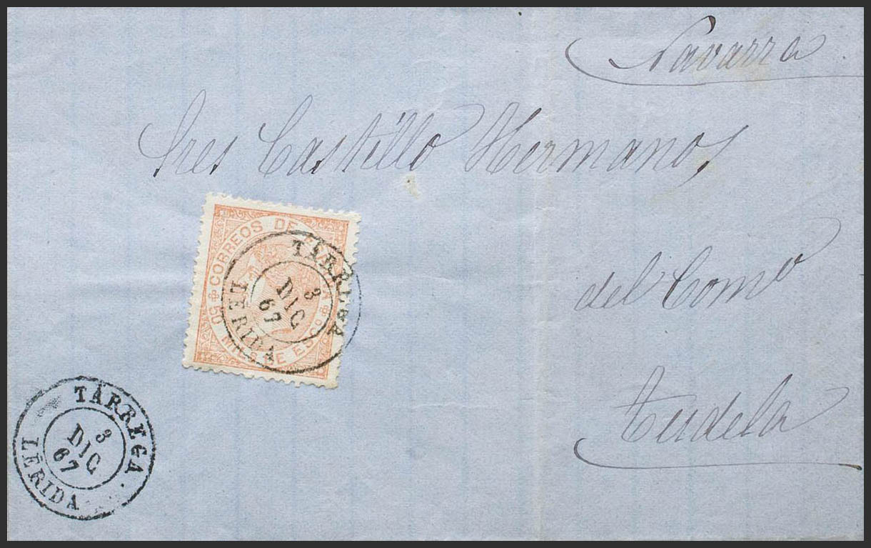 96. 1867. 50 mils castaño amarillo. VALLS a TUDELA. Matasello TARREGA / LERIDA. MAGNIFICA. Ex-Tizón.