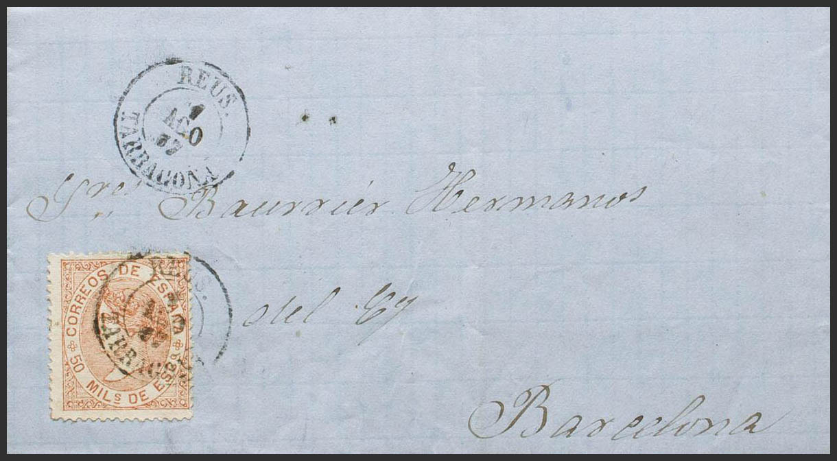 96. 1867. 50 mils castaño amarillo. REUS a BARCELONA. Matasello REUS / TARRAGONA. MAGNIFICA. Ex-Tizón.