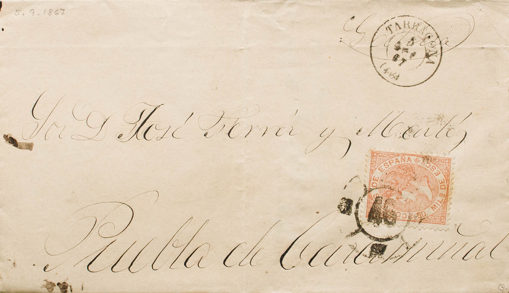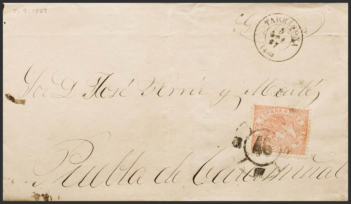 96. 1867. 50 mils castaño amarillo. TARRAGONA a PUEBLA DEL CARAMIÑAL. Matasello R.CARRETA Nº46. MAGNIFICA. Ex-Tizón.