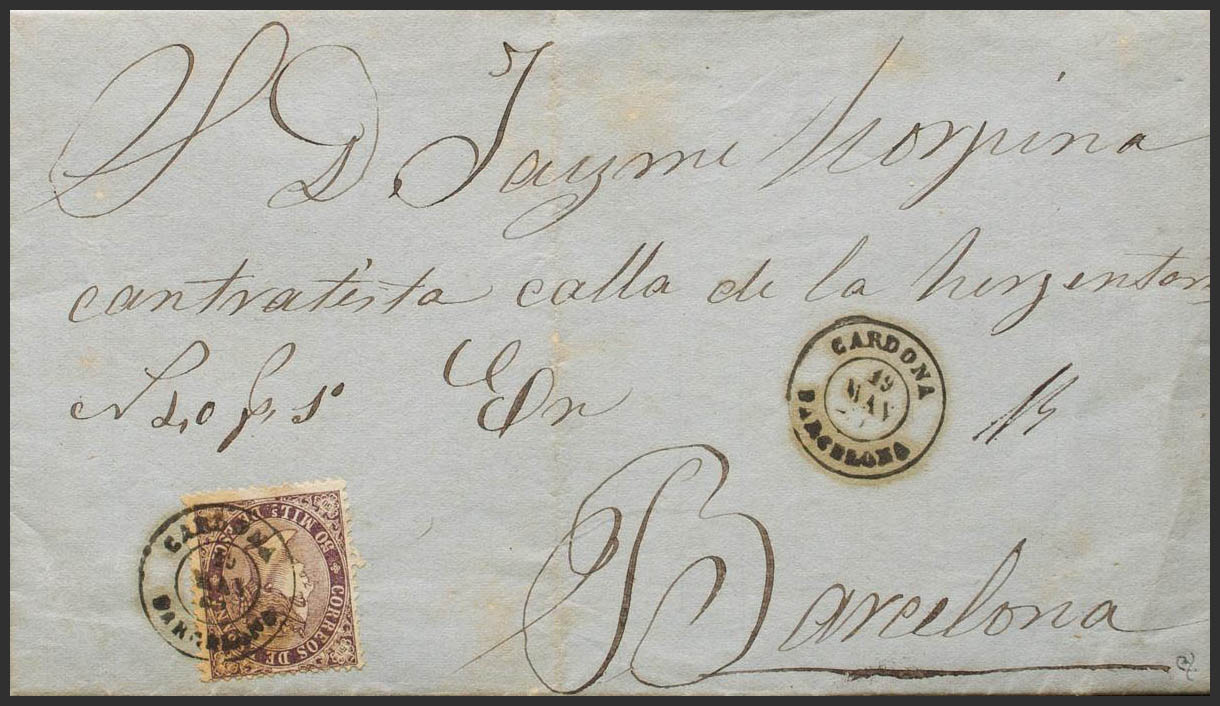 98. 1869. 50 mils violeta. CARDONA a BARCELONA. Matasello CARDONA / BARCELONA. MAGNIFICA Y RARA. Ex-Tizón.