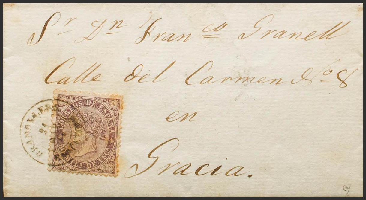 98. 1869. 50 mils violeta. GRANOLLERS a BARCELONA. Matasello GRANOLLERS / BARCELONA. MAGNIFICA Y RARA. Ex-Tizón.