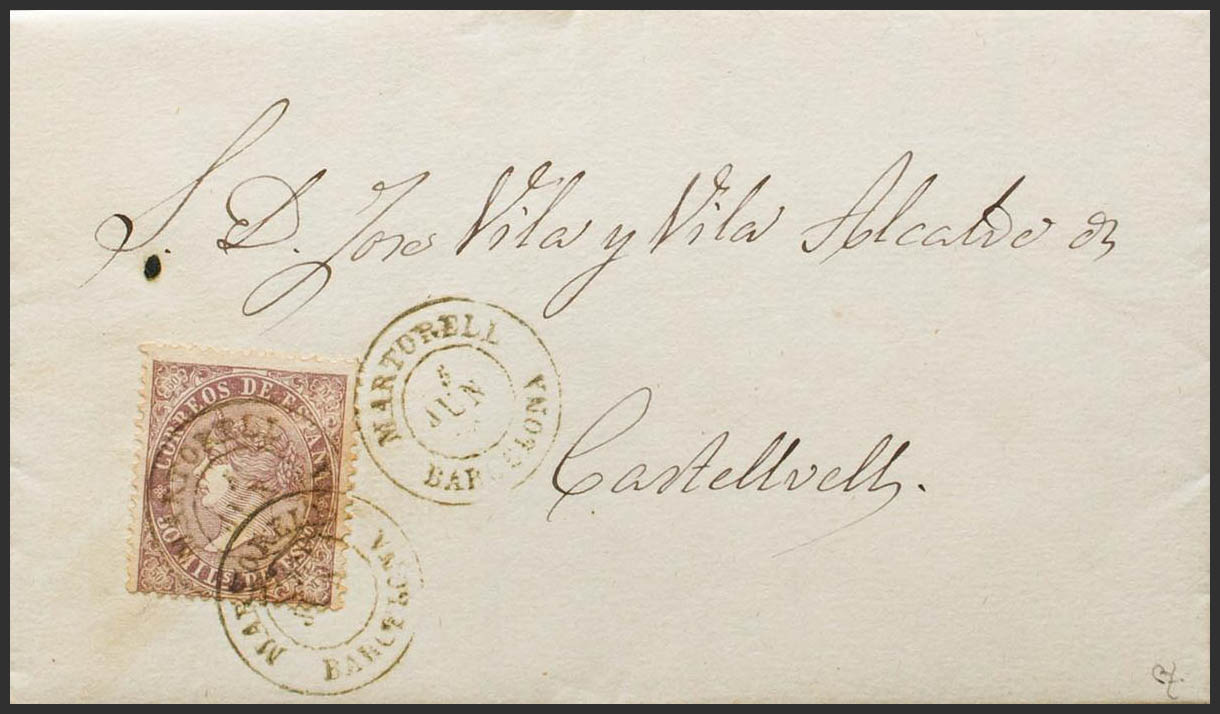 98. 1869. 50 mils violeta. ESPARRAGUERA a CASTELLVELL. Matasello MARTORELL / BARCELONA. MAGNIFICA Y RARA. Ex-Tizón.