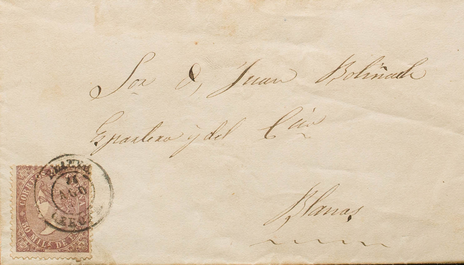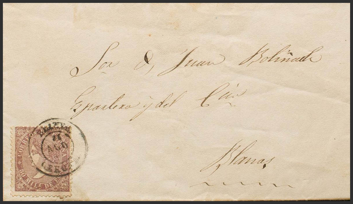 98. 1869. 50 mils violeta. SANTA COLOMA a BLANES. Matasello BLANES / GERONA, aplicado a la llegada. MAGNIFICA Y MUY RARA. Ex-Tizón.