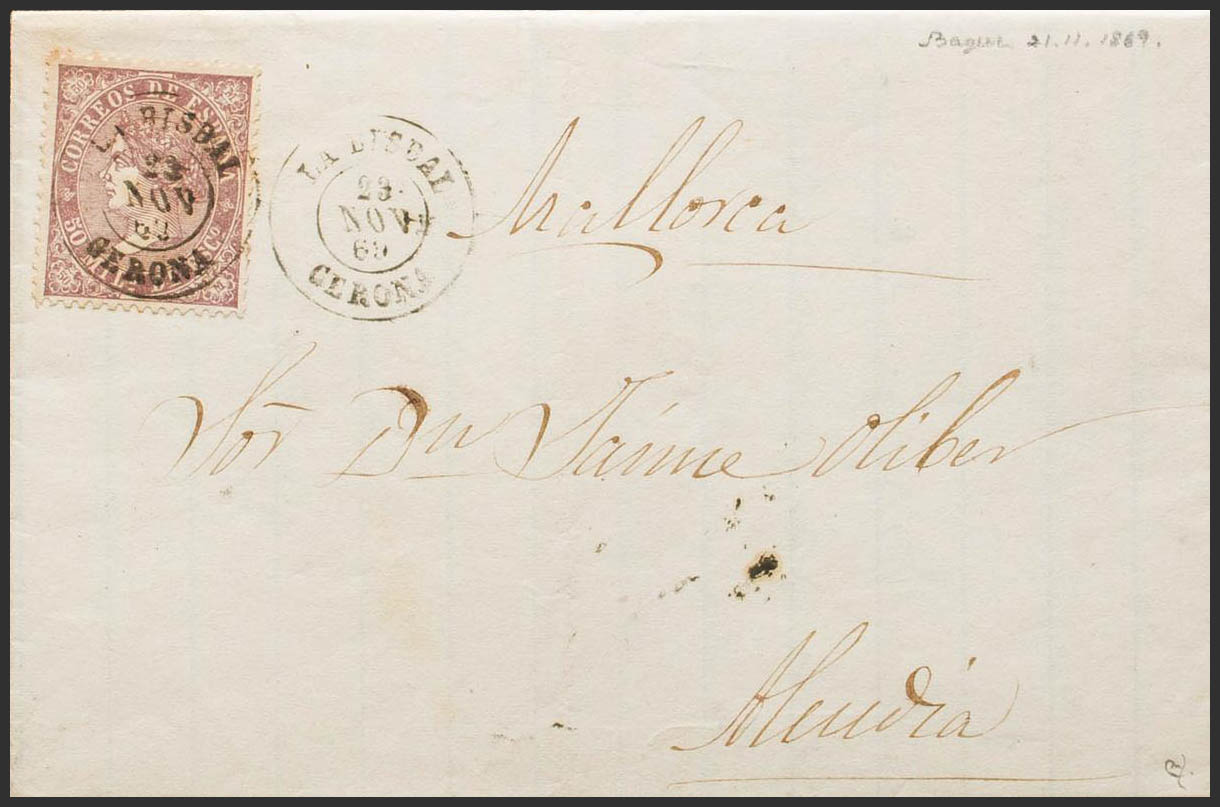 98. 1869. 50 mils violeta. BAGUR a ALCUDIA. Matasello LA BISBAL / GERONA. MAGNIFICA Y RARA. Ex-Tizón.