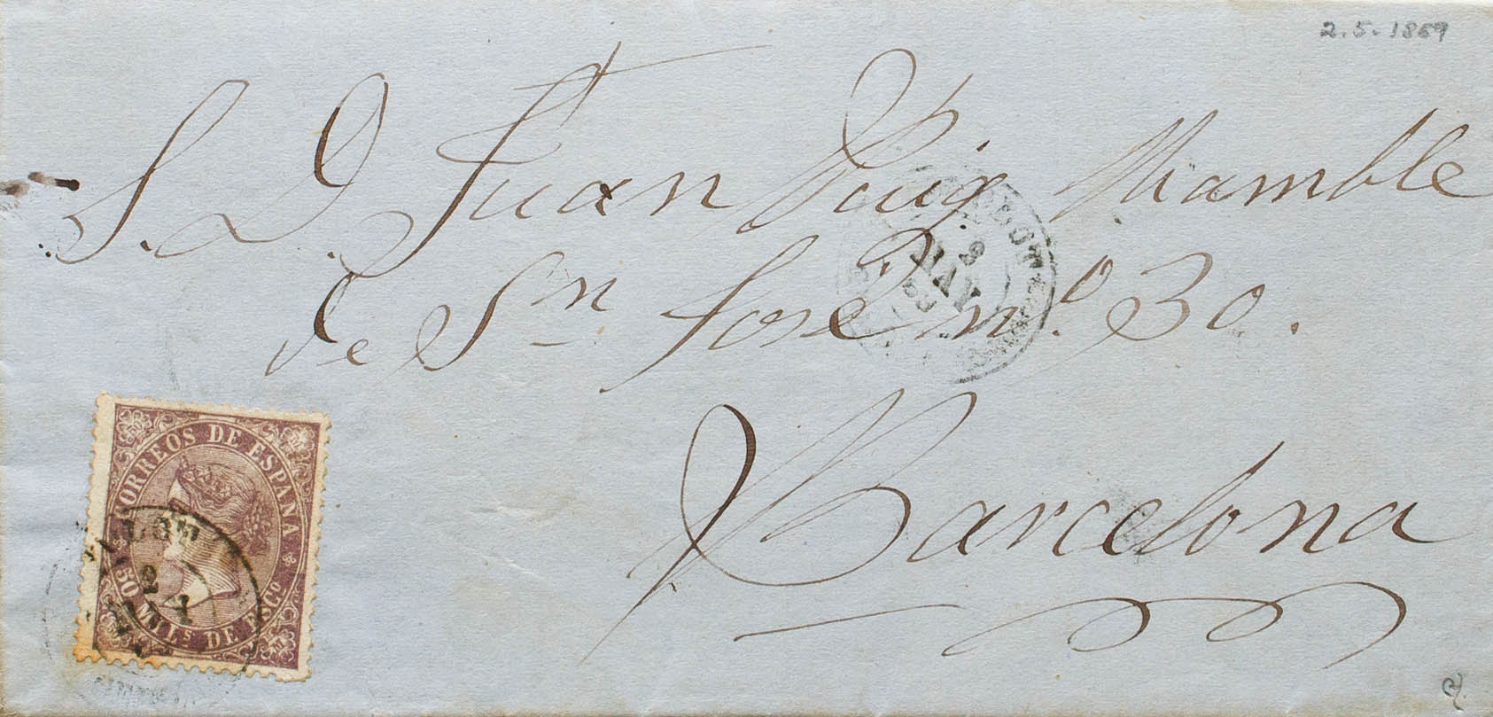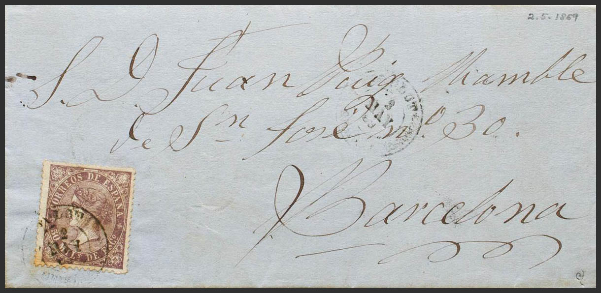 98. 1869. 50 mils violeta. OLOT a BARCELONA. Matasello OLOT / GERONA. MAGNIFICA. Ex-Tizón.