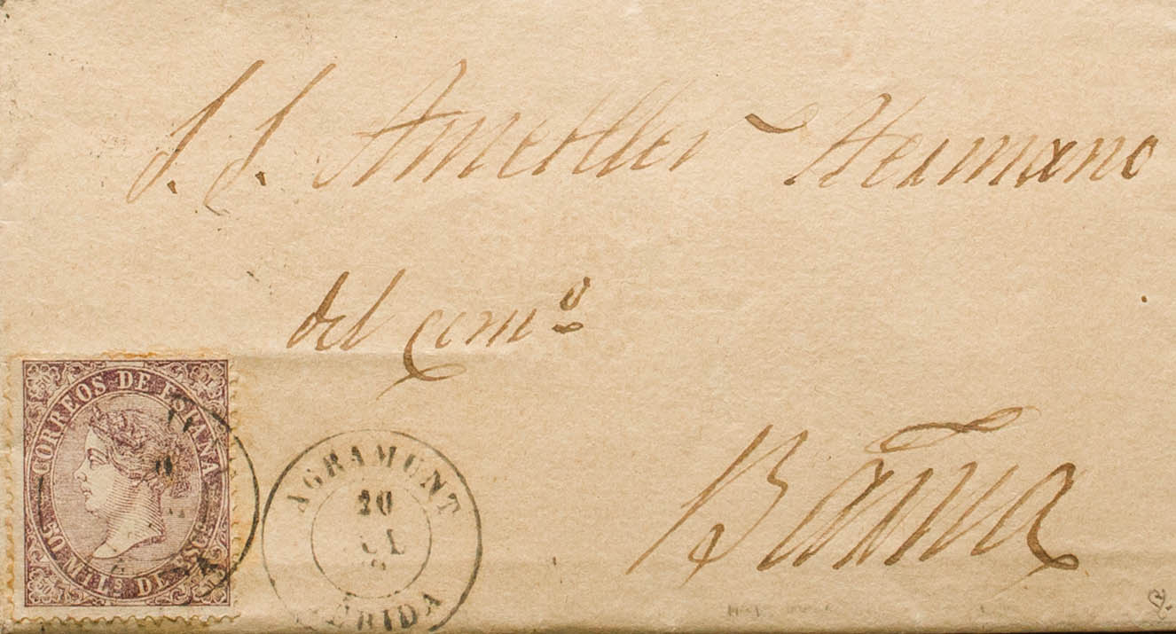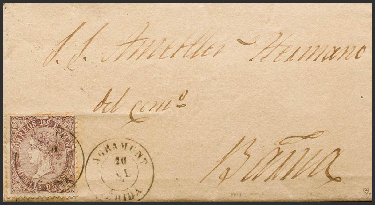 98. 1869. 50 mils violeta. AGRAMUNT a LERIDA. Matasello AGRAMUNT / LERIDA. MAGNIFICA. Ex-Tizón.