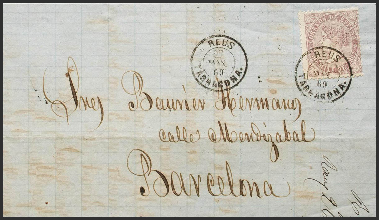98. 1869. 50 mils violeta. REUS a BARCELONA. Matasello REUS / BARCELONA. MAGNIFICA. Ex-Tizón.