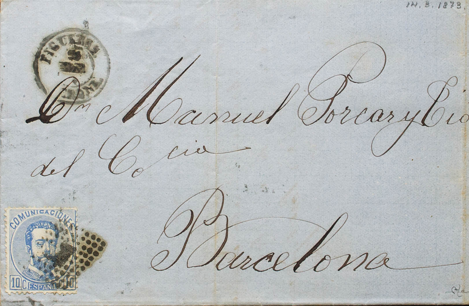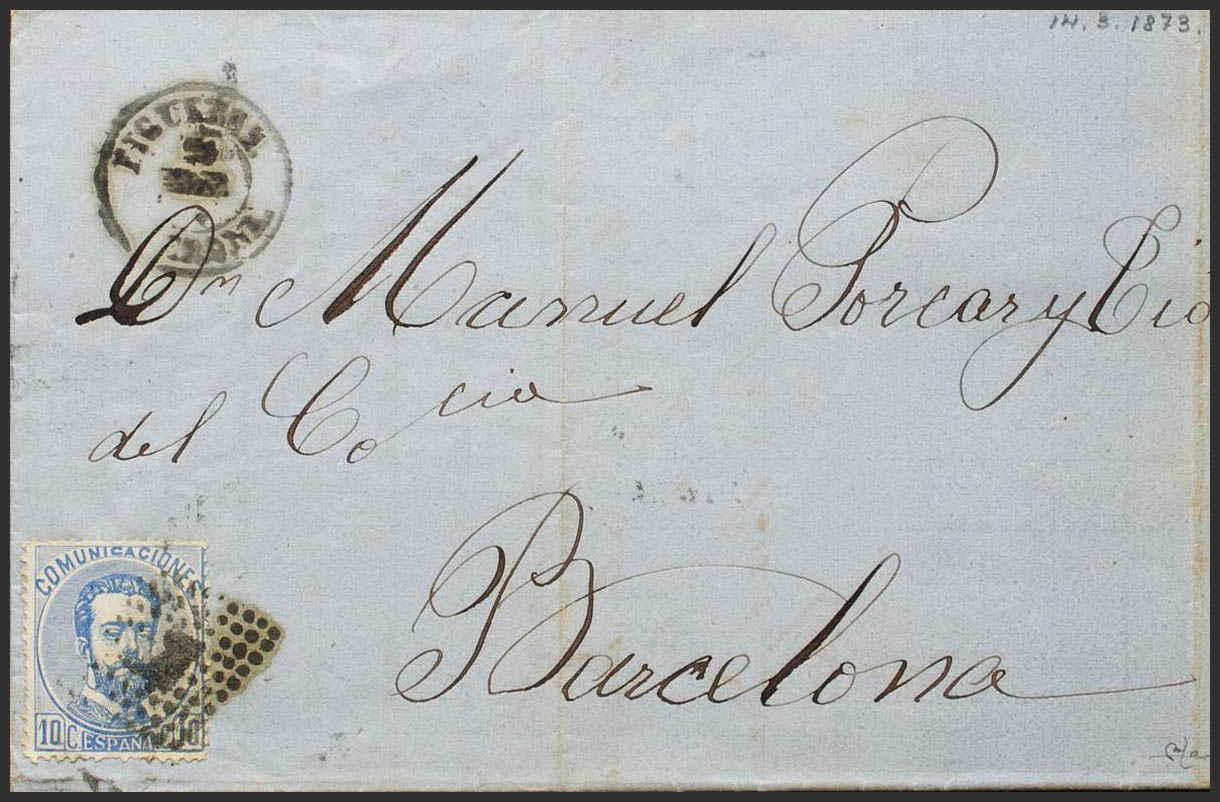 121. 1873. 10 cts ultramar. FIGUERAS a BARCELONA. En el frente fechador FIGUERAS / GERONA. MAGNIFICA. Ex-Tizón.