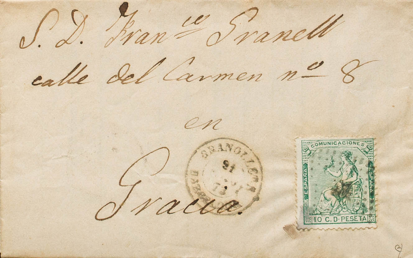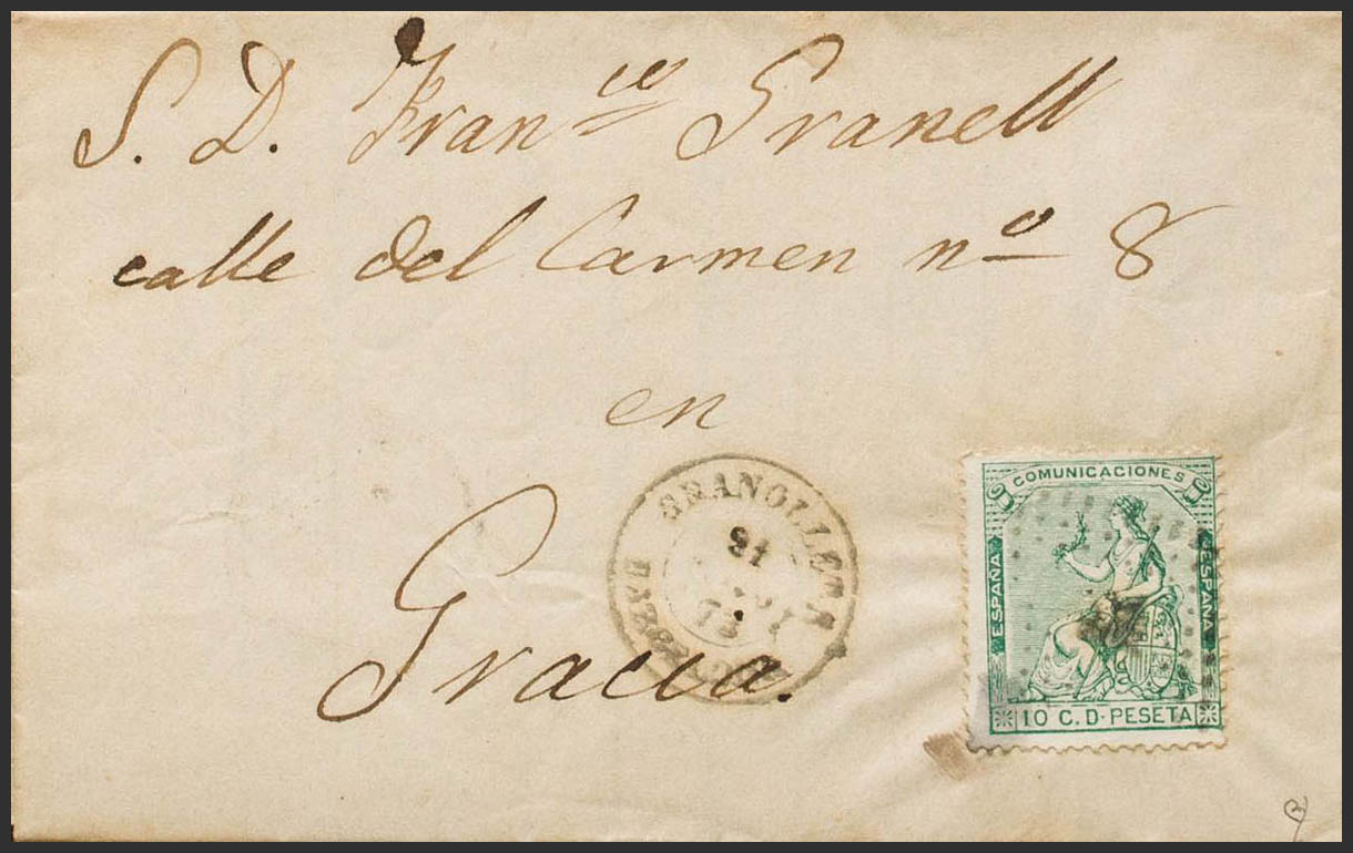133. 1873. 10 cts verde. GRANOLLERS a GRACIA. En el frente fechador GRANOLLERS / BARCELONA. MAGNIFICA. Ex-Tizón.