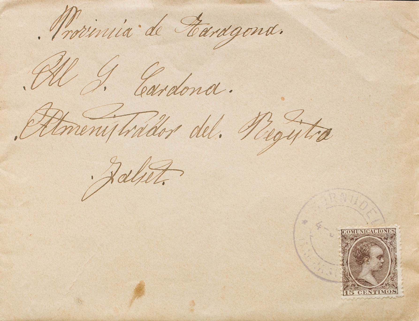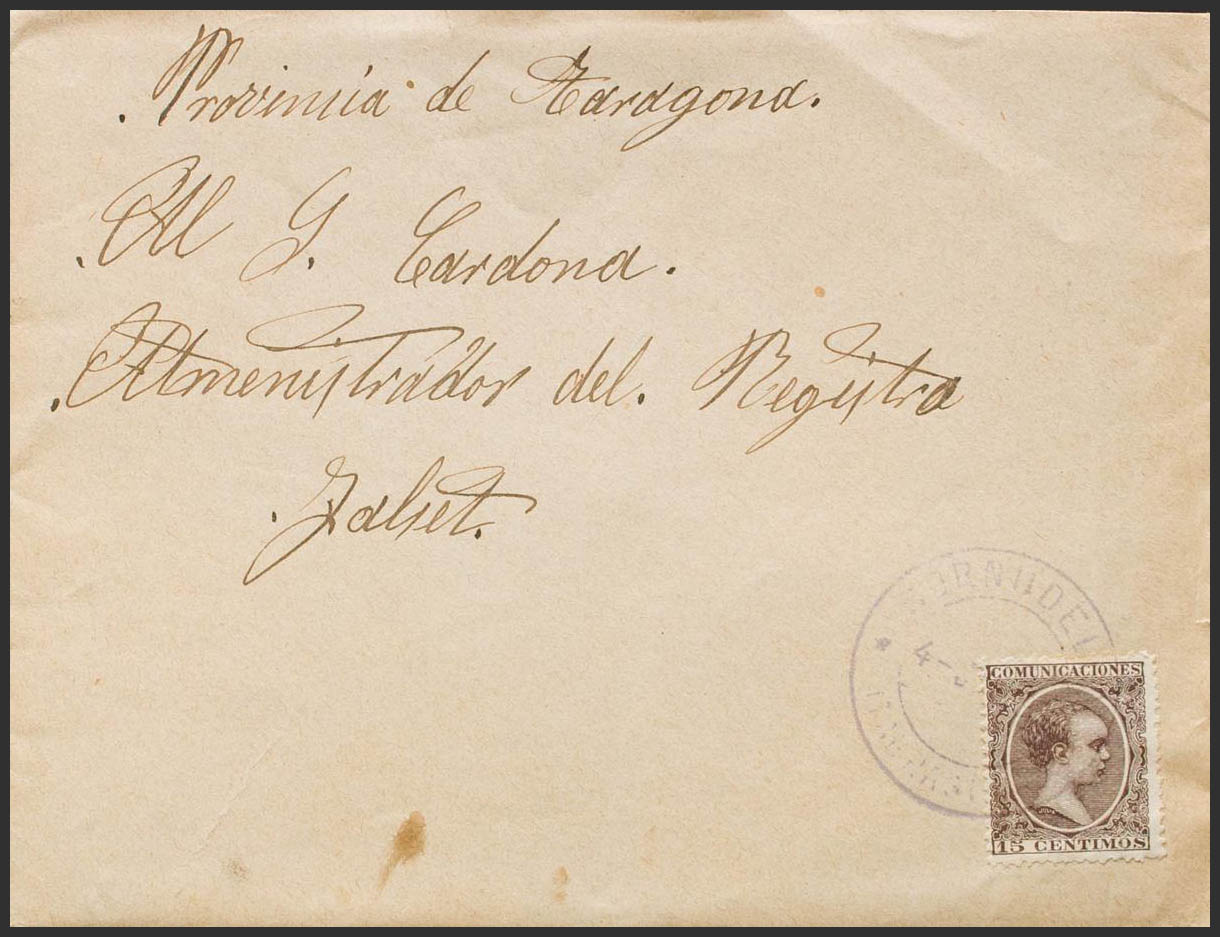 219. 1897. 15 cts castaño violeta. ULLDEMOLINS a FALSET. Matasello CORNUDELLA / (TARRAGONA), en violeta. MAGNIFICA Y RARA. Ex-Tizón.