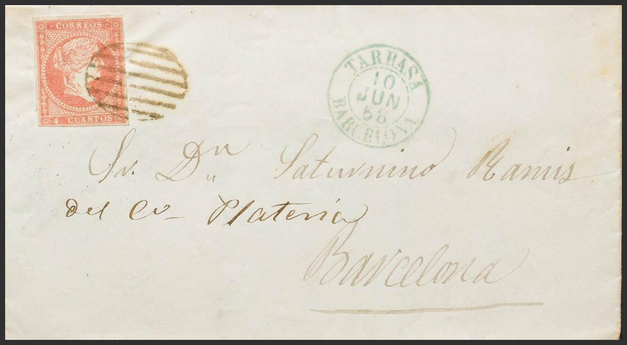48. 1858. 4 cuartos rojo. TARRASA a BARCELONA. Matasello TARRASA / BARCELONA (Tipo I), en azul. MAGNIFICA. Ex-Tizón.