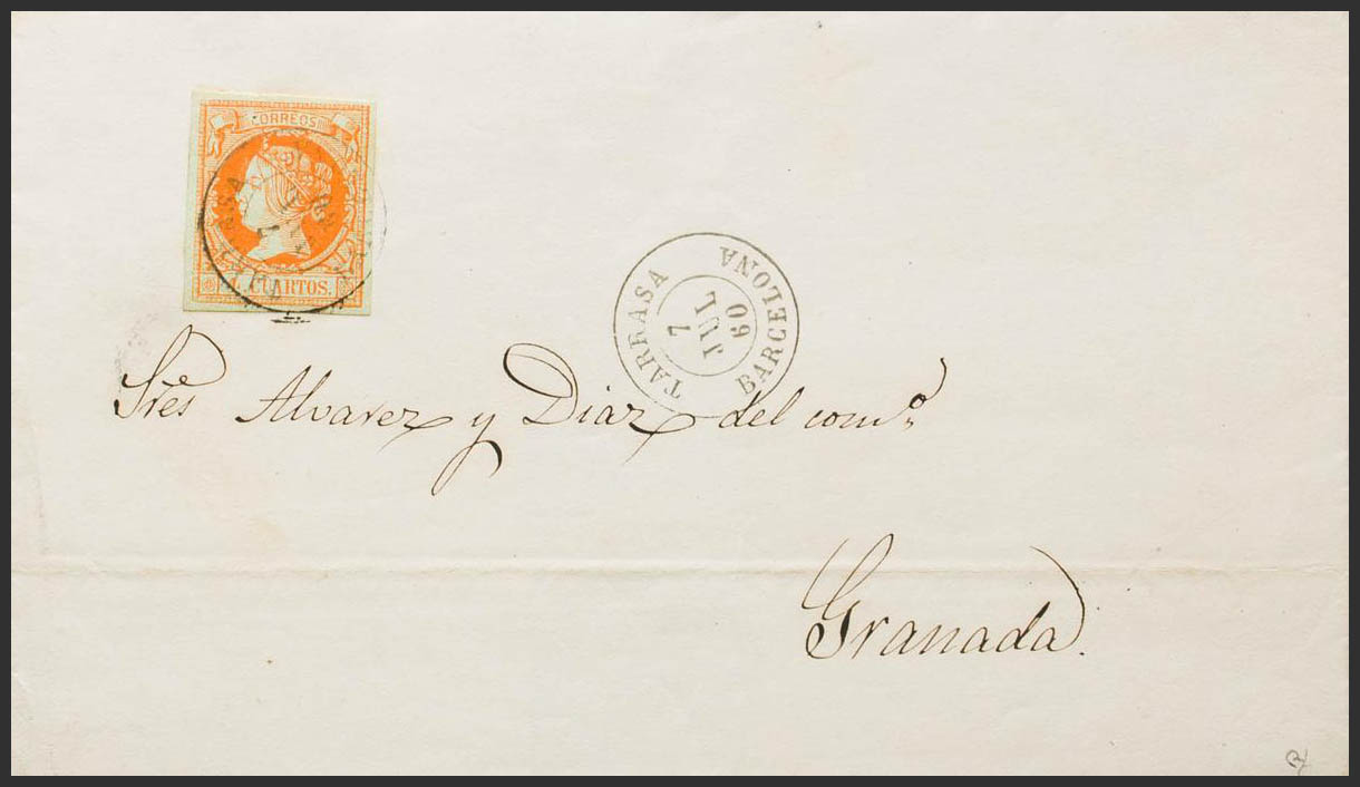52. 1860. 4 cuartos naranja. TARRASA a GRANADA. Matasello TARRASA / BARCELONA. MAGNIFICA. Ex-Tizón.