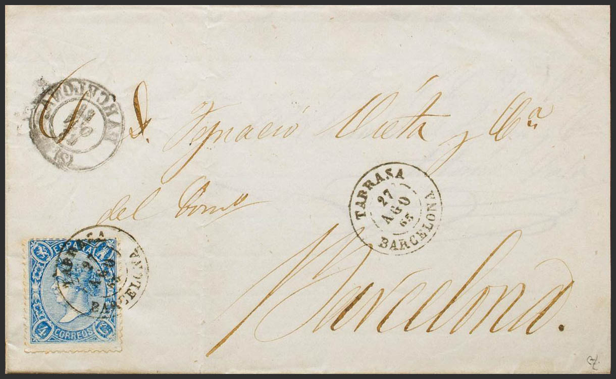 75. 1865. 4 cuartos azul. TARRASA a BARCELONA. Matasello TARRASA / BARCELONA. MAGNIFICA. Ex-Tizón.