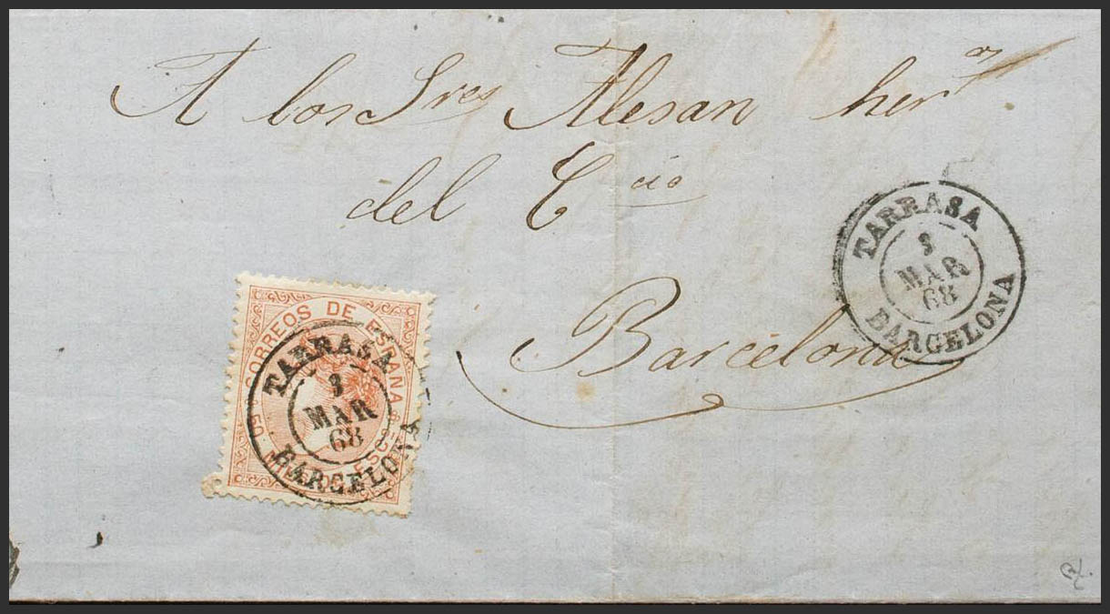 96. 1868. 50 mils castaño amarillo. TARRASA a BARCELONA. Matasello TARRASA / BARCELONA. MAGNIFICA. Ex-Tizón.