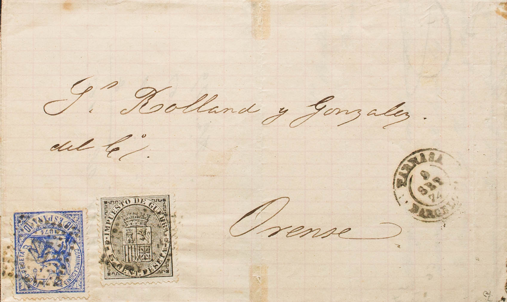 145, 141. 1874. 10 cts ultramar y 5 cts negro. TARRASA a ORENSE. MAGNIFICA. Ex-Tizón.