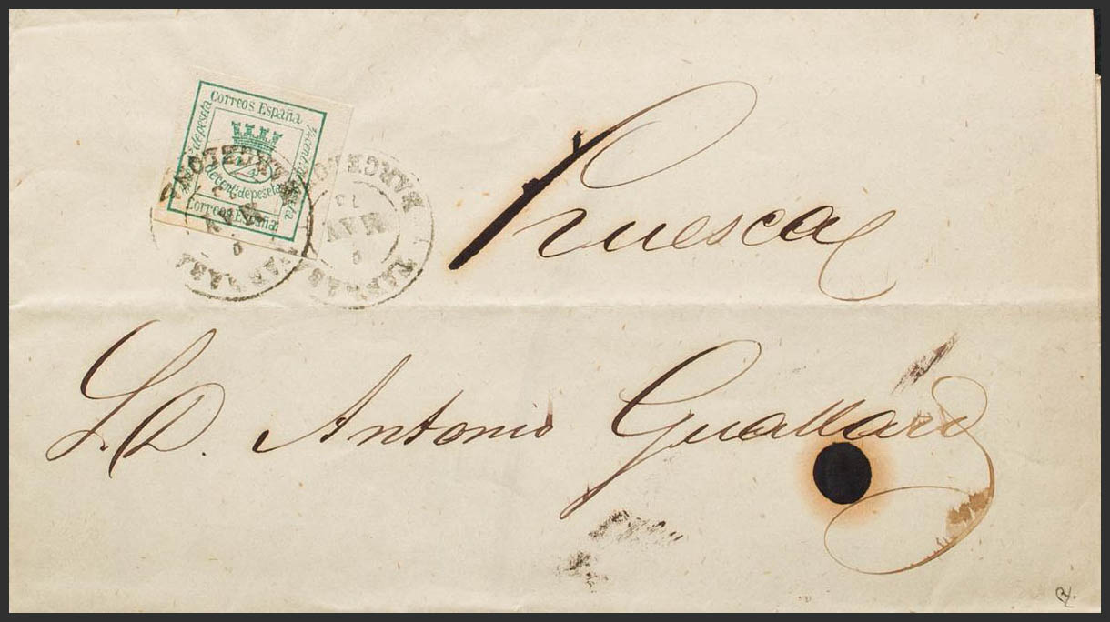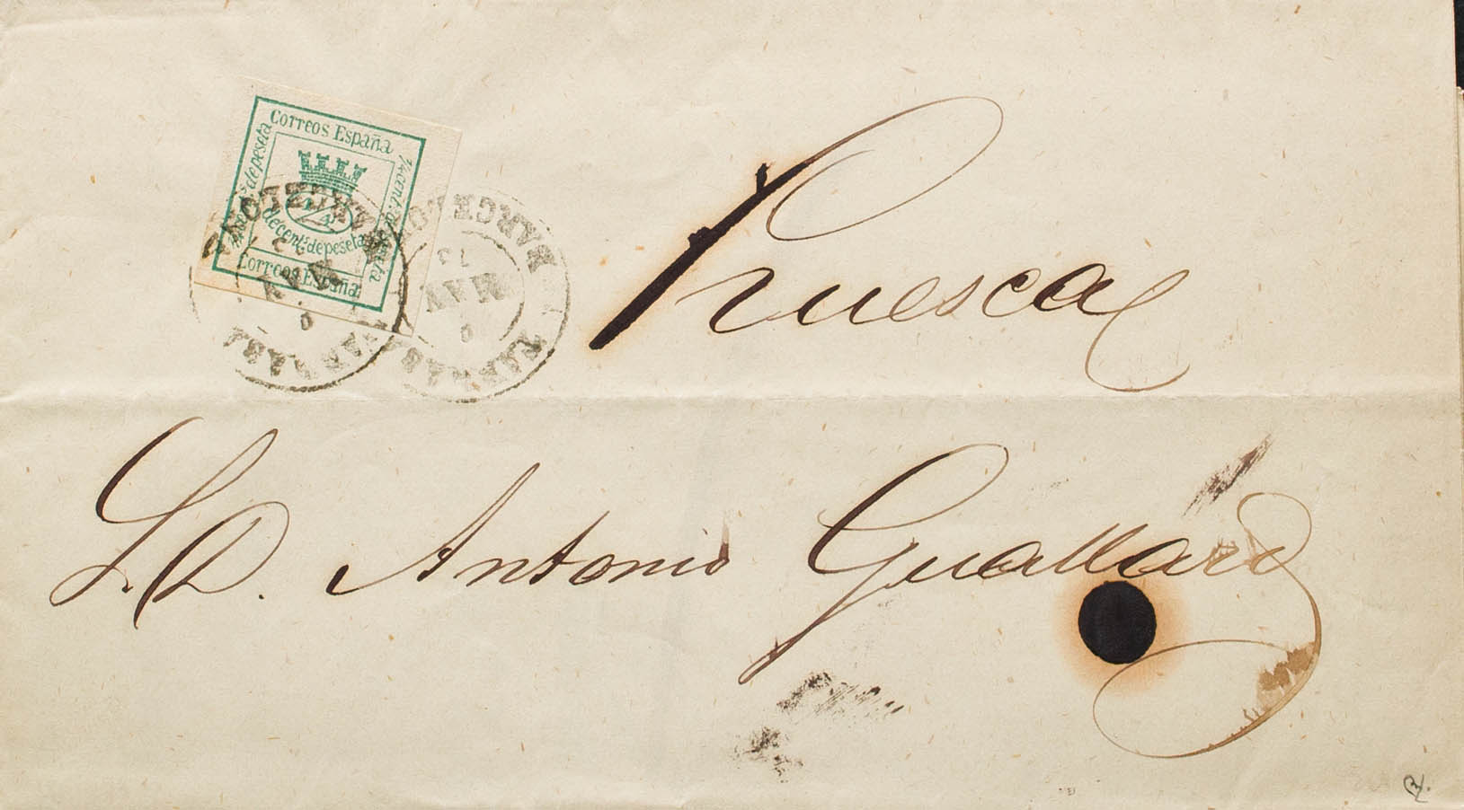 130. 1875. ¼ cts verde. Impreso de TARRASA a HUESCA. Matasello TARRASA / BARCELONA. MAGNIFICA Y RARA. Ex-Tizón.