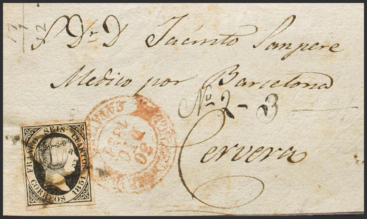 6. 1851. 6 cuartos negro. Frontal de TORREDEMBARRA a CERVERA. Matasello ARAÑA y baeza TORREDEMBARRA / CATALUÑA. MAGNIFICA Y RARISIMA. Ex-Tizón.