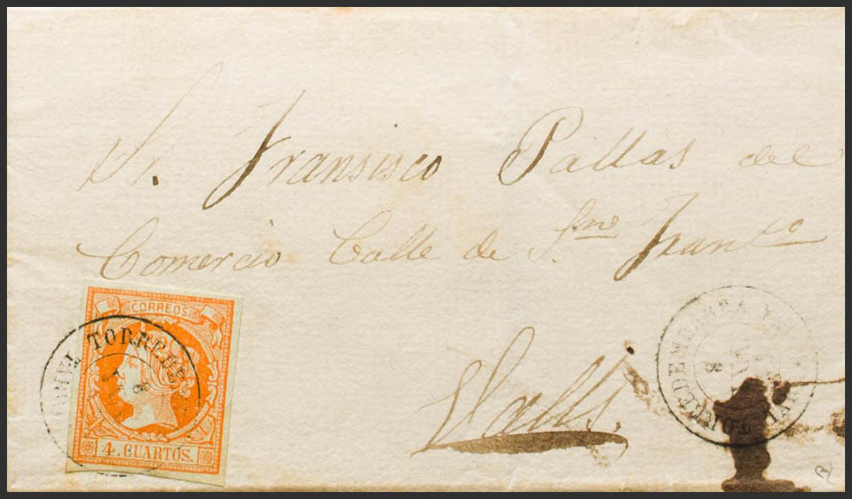 52. 1860. 4 cuartos naranja. TORREDEMBARRA a VALLS. Matasello TORREDEMBARRA / TARRAGONA. MAGNIFICA. Ex-Tizón.