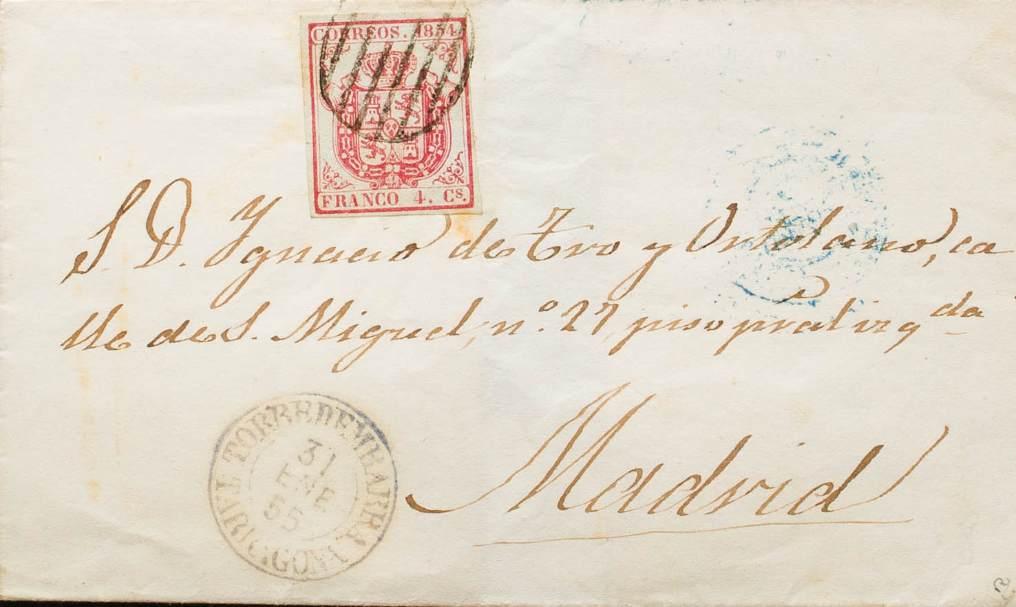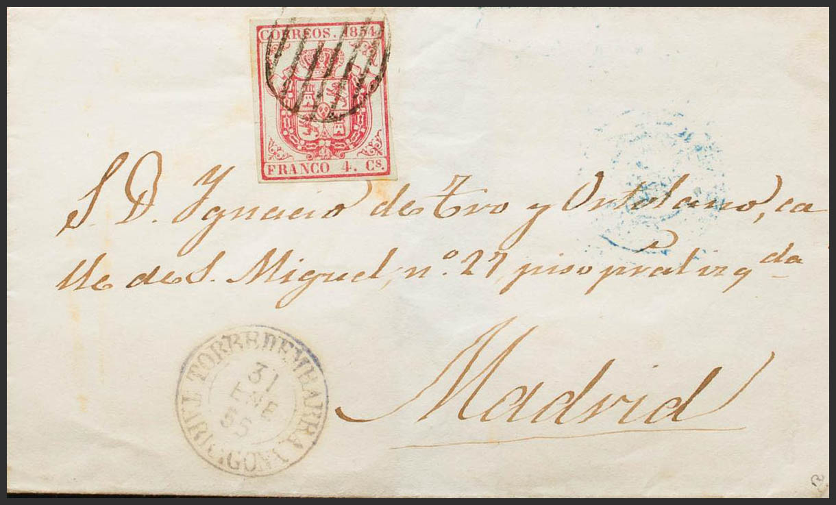 33A. 1855. 4 cuartos carmÃn. TORREDEMBARRA a MADRID. En el frente fechador TORREDEMBARRA / TARRAGONA (Tipo I), en azul. MAGNIFICA Y RARA. Ex-Tizón.