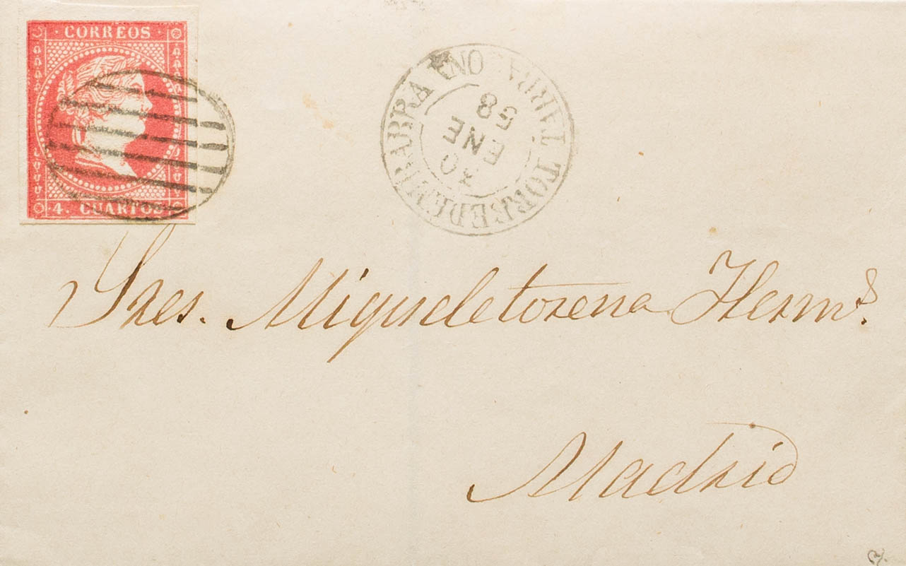 48. 1858. 4 cuartos rojo. TORREDEMBARRA a MADRID. En el frente fechador TORREDEMBARRA / TARRAGONA (Tipo I). MAGNIFICA. Ex-Tizón.