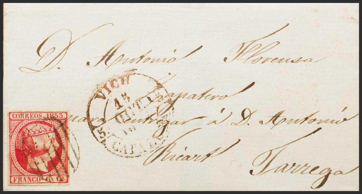 17. 1853. 6 cuartos rosa. VICH a TARREGA. En el frente baeza VICH / CATALUÑA. MAGNIFICA. Ex-Tizón.