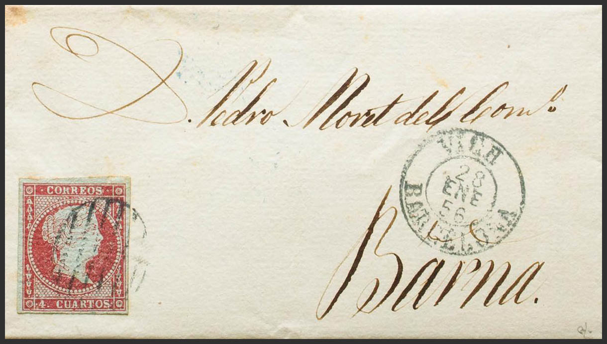 40. 1856. 4 cuartos rojo. VICH a BARCELONA. En el frente fechador VICH / BARCELONA (Tipo I). MAGNIFICA. Ex-Tizón.