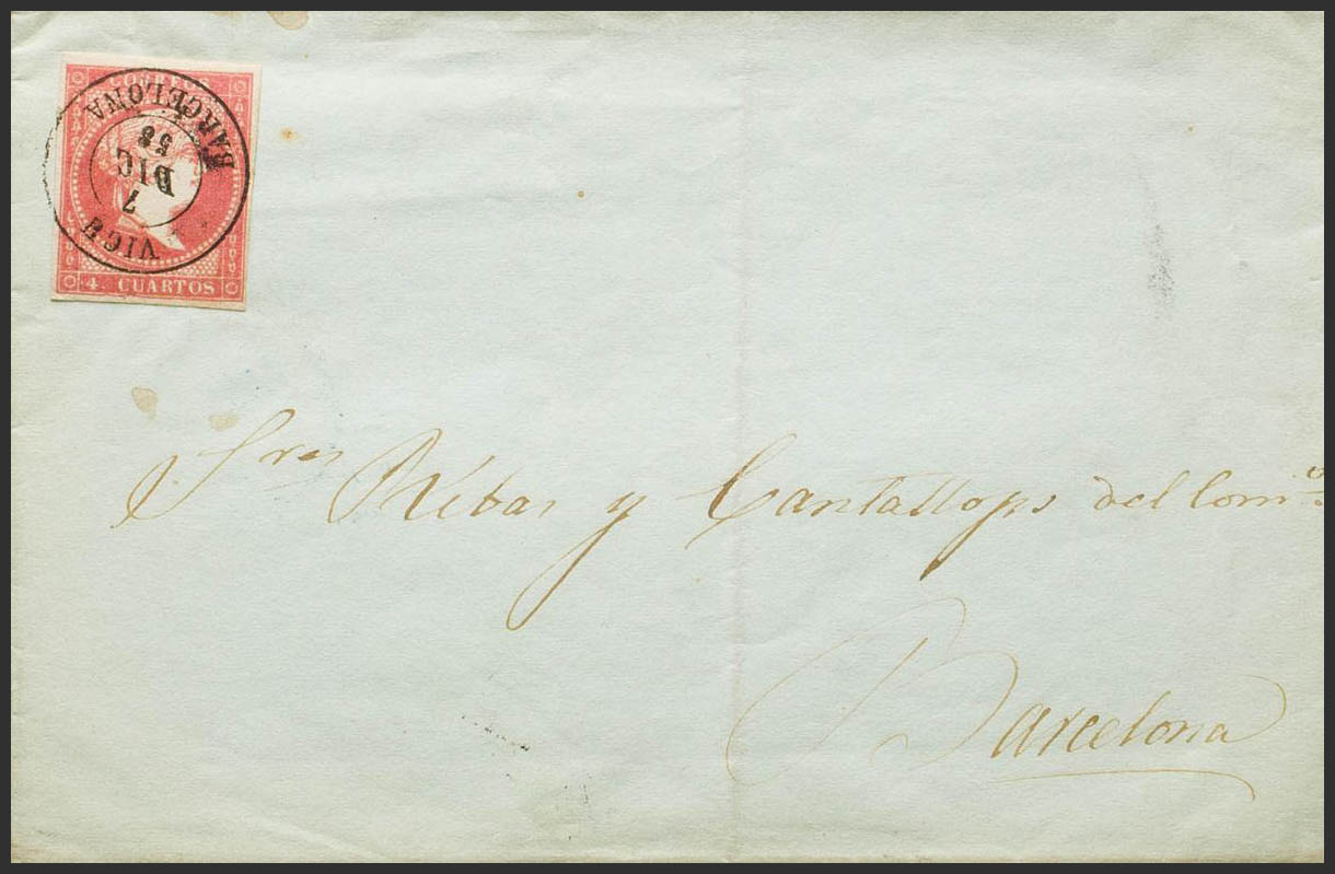 48. 1858. 4 cuartos rojo. VICH a BARCELONA. Matasello VICH / BARCELONA. MAGNIFICA. Ex-Tizón.