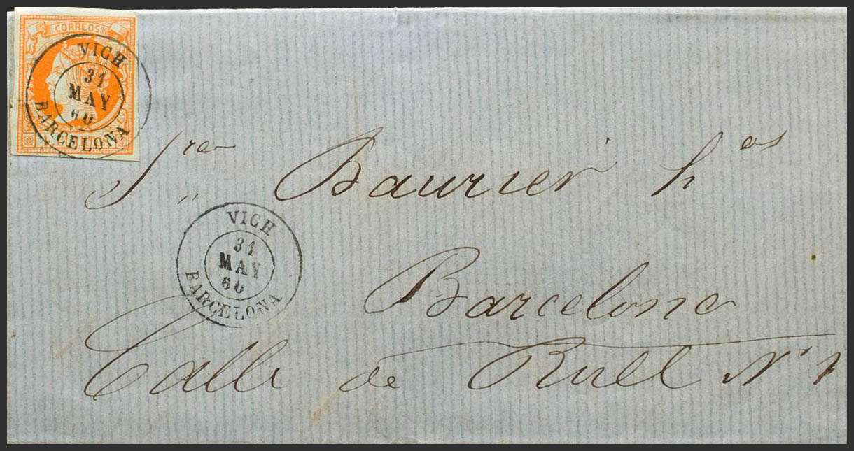 52. 1860. 4 cuartos naranja. RODA a BARCELONA. Matasello VICH / BARCELONA. MAGNIFICA. Ex-Tizón.