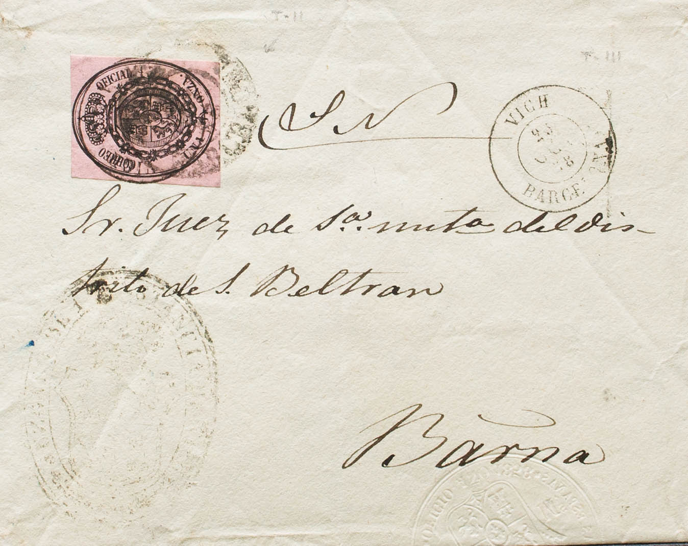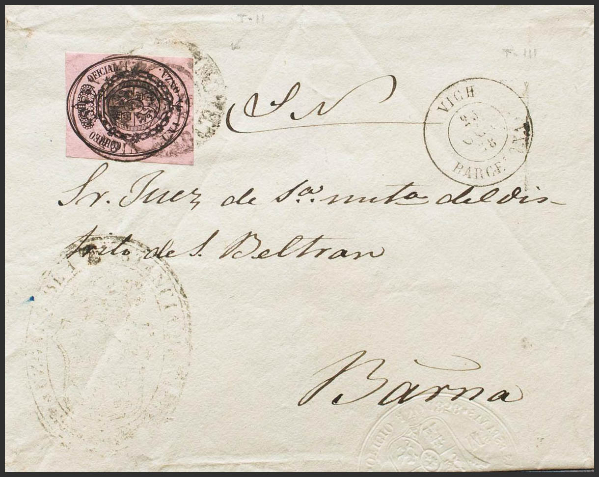 36. 1858. 1 onza negro sobre rosa. VICH a BARCELONA. Matasello VICH / BARCELONA (Tipo I). MAGNIFICA Y MUY RARA. Ex-Tizón.