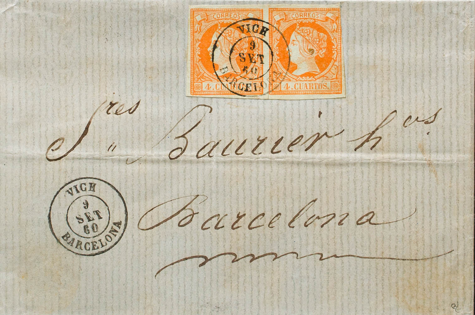 52(2). 1860. 4 cuartos naranja, pareja. RODA a BARCELONA. Matasello VICH / BARCELONA, doble porte. MAGNIFICA. Ex-Tizón.