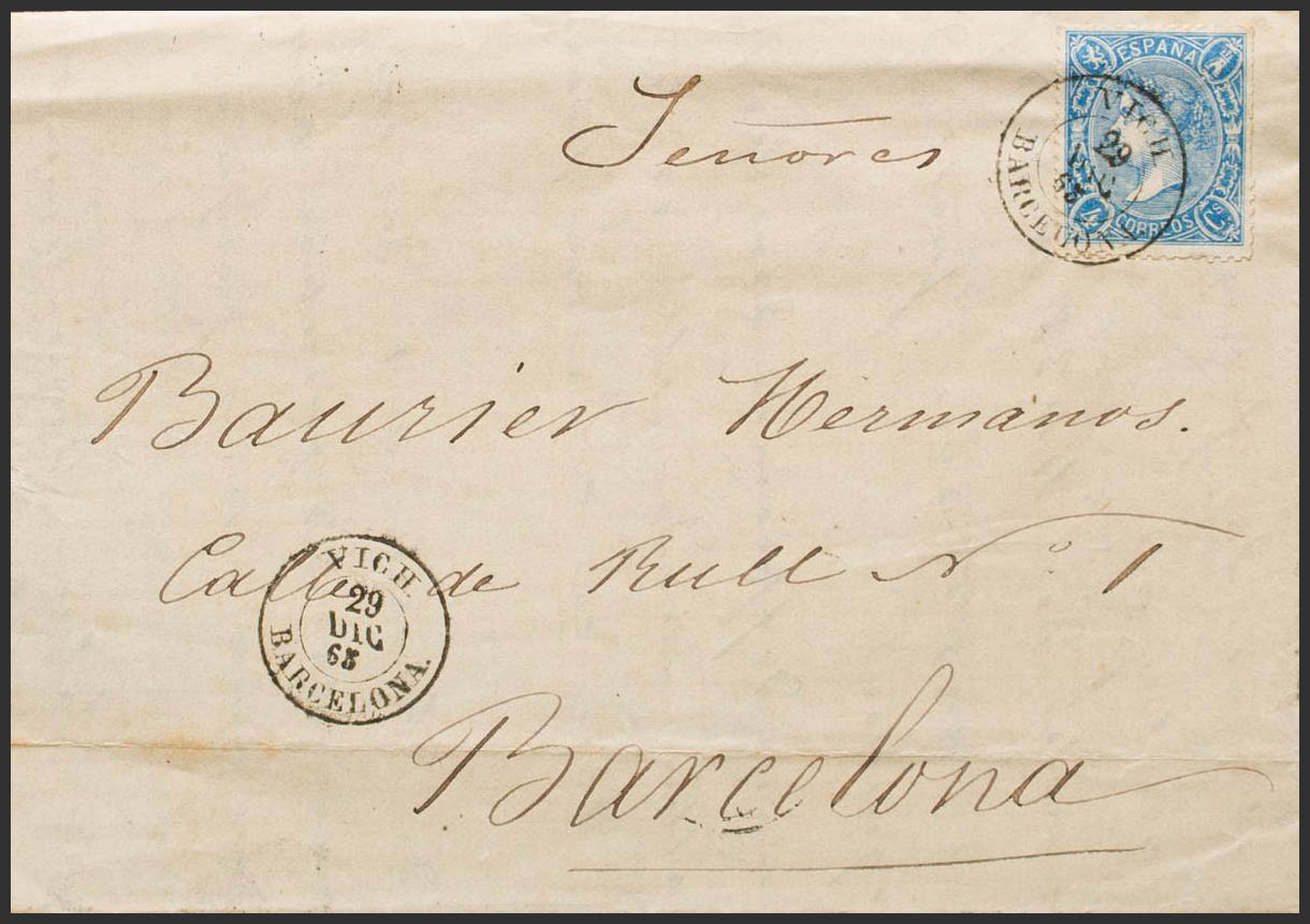 75. 1865. 4 cuartos azul. RODA a BARCELONA. Matasello VICH / BARCELONA. MAGNIFICA. Ex-Tizón.