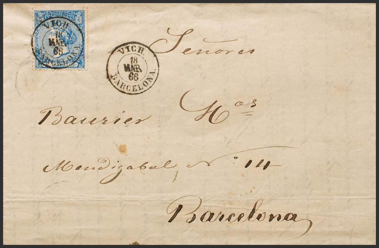 81. 1866. 4 cuartos azul. RODA a BARCELONA. Matasello VICH / BARCELONA. MAGNIFICA. Ex-Tizón.