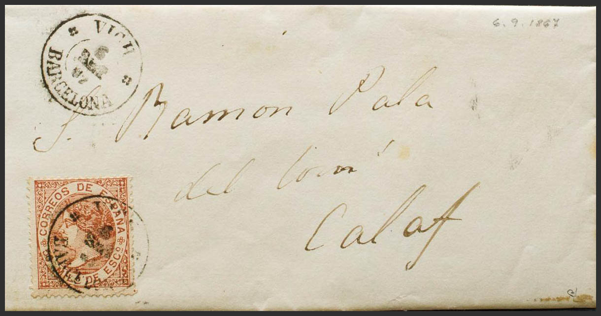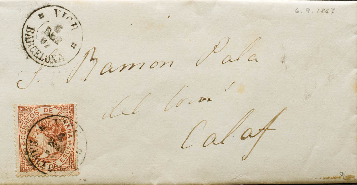 96. 1867. 50 mils castaño amarillo. VICH a CALAF. Matasello especial (con adornos) VICH / BARCELONA. MAGNIFICA Y RARA. Ex-Tizón.