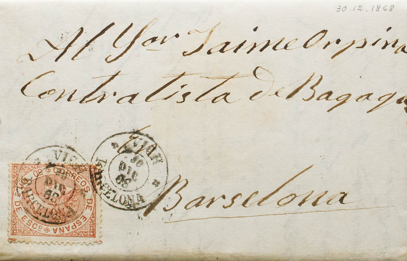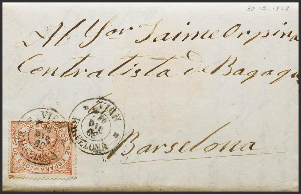 96. 1868. 50 mils castaño amarillo. VICH a CALAF. Matasello especial (con adornos) VICH / BARCELONA. MAGNIFICA. Ex-Tizón.